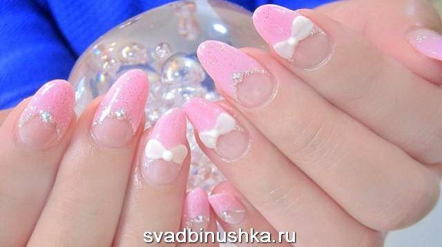 Под нежно-розовое платье или букет – соответствующий цвет. Его можно сочетать с белоснежным френчем, мелкими кристаллами, лепкой и бархатом.