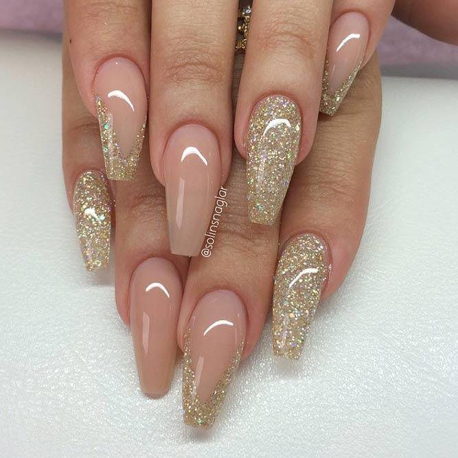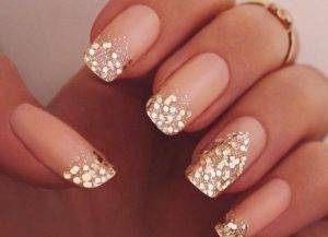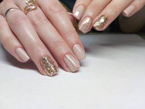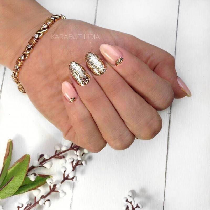 То, что нюдовые оттенки прекрасно смотрятся в тандеме с золотистыми нейл-украшениями давно не новость. Все, что напоминает нам золото (фольга, полоски, блестки, наклейки, втирка и т.п.) на нюдовых ногтях смотрится божественно и стильно.