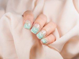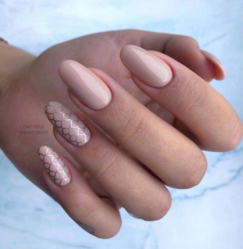 Очень красиво и необычно на ногтях будет смотреться перламутровый нюдовый маникюр с изящным узором, нанесенным в технике стемпинга. Для нежности дизайна лучше использовать белую краску для стемпинга.