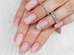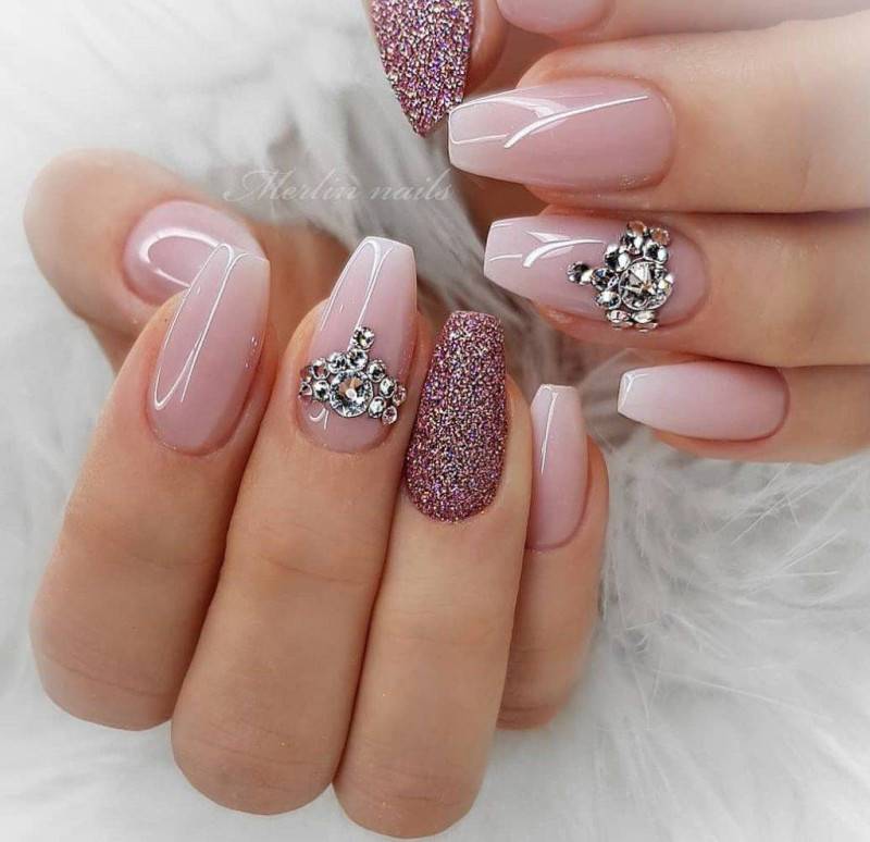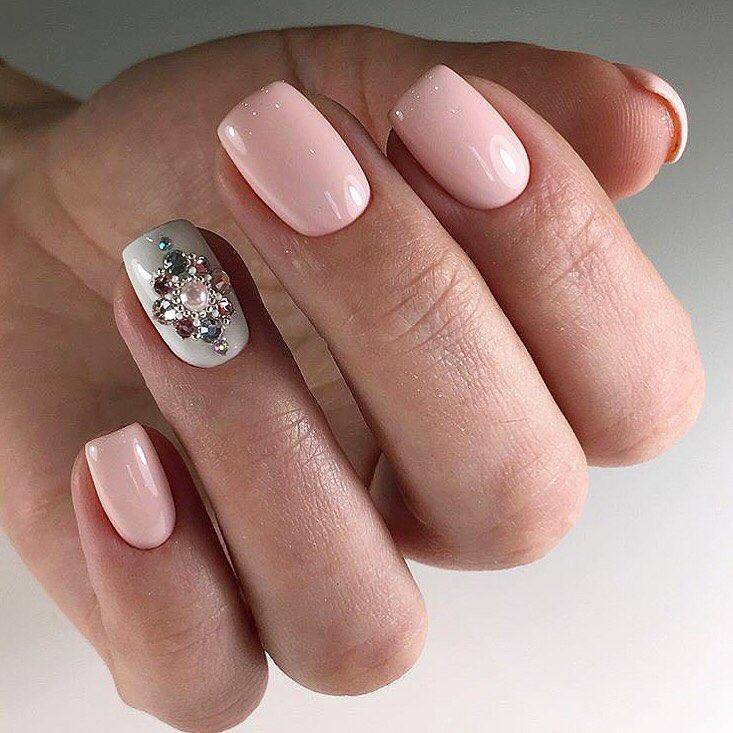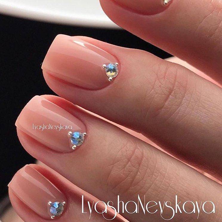 Здесь нас учат, насколько потрясающе может выглядеть балетно-розовый маникюр, просто добавив несколько драгоценных камней у основания каждого безымянного пальца.