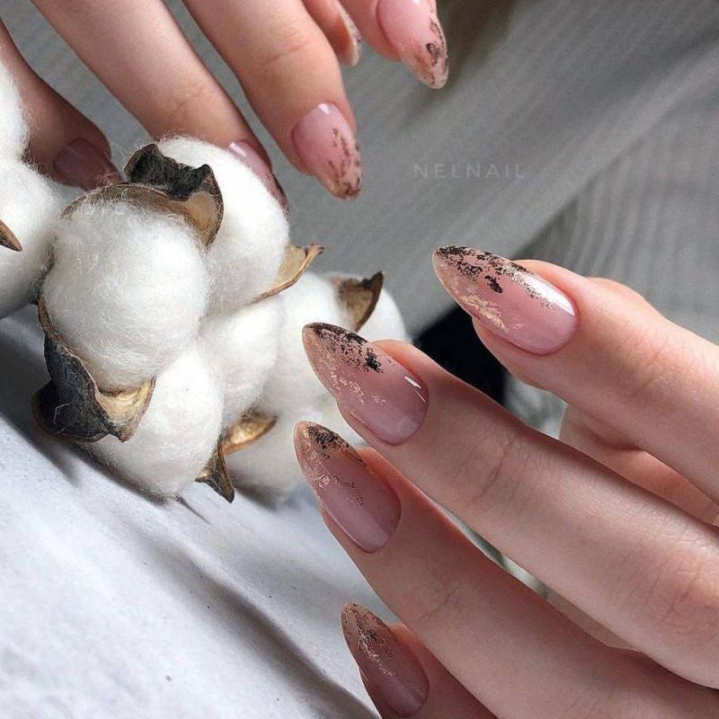 Простой и одновременно эффектный дизайн длинных нюдовых ногтей получится с фольгой. Модных вариантов подобного маникюра очень много, так как оттенок фольги, ее фактура и декорирование ею ногтей не ограничено фантазией мастера.