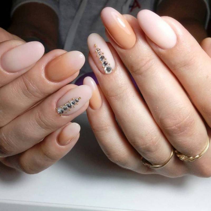 Иногда бывает сложно определиться: стразы или блестки использовать в дизайне нюдового маникюра? Зачем выбирать, вместе блестки и стразы смотрятся еще круче и красивее. Сделайте на указательном ноготке инкрустацию, а мизинец покройте глиттером.
