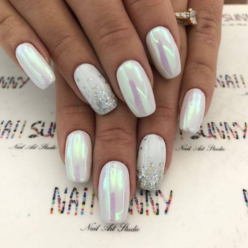 Также в настоящее время набирает обороты дизайн с использованием перламутровых гель-лаков. С помощью дотса создаётся жемчужное покрытие и как раз для свадебного маникюра этот дизайн будет смотреться очень актуально.
