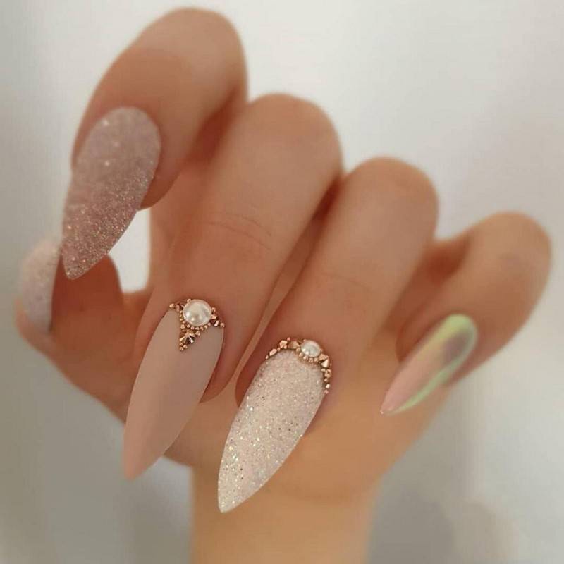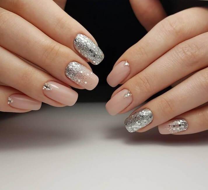 Стоит быть осторожной с глиттером — маникюр на свадьбу невесте с использованием блесток выглядит очень эффектно, но важно гармонично сочетать его с платьем. Если у твоего наряда теплый подтон — выбирай золотой глиттер, если холодный — серебряный