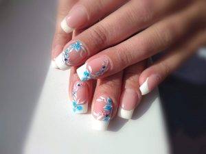 Фэшн-новинка для квадратных ногтей с френчем – отделка кончиков вместо белого цвета золотой или серебряной фольгой. Среди последних тенденций также кружевные росписи, вензеля, красивые рисунки в виде цветка, бабочки, бантиков, голубей. Подборка фото на свадьбу: