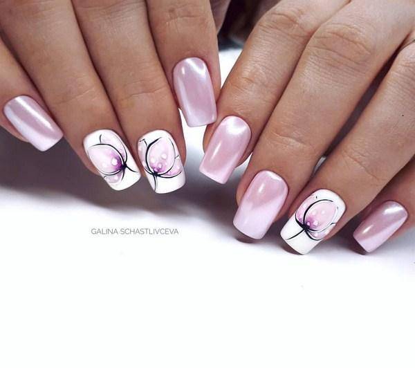 Свадьбы ассоциируются не только с кольцами, голубями, белым. Ни одна свадьба не обходится без украшения цветами и композиций из них, бутоньерок в виде бутонов цветов и конечно прекрасного букета невесты. Поэтому использование цветочных мотивов в дизайне свадебного маникюра предсказуемо и уместно.