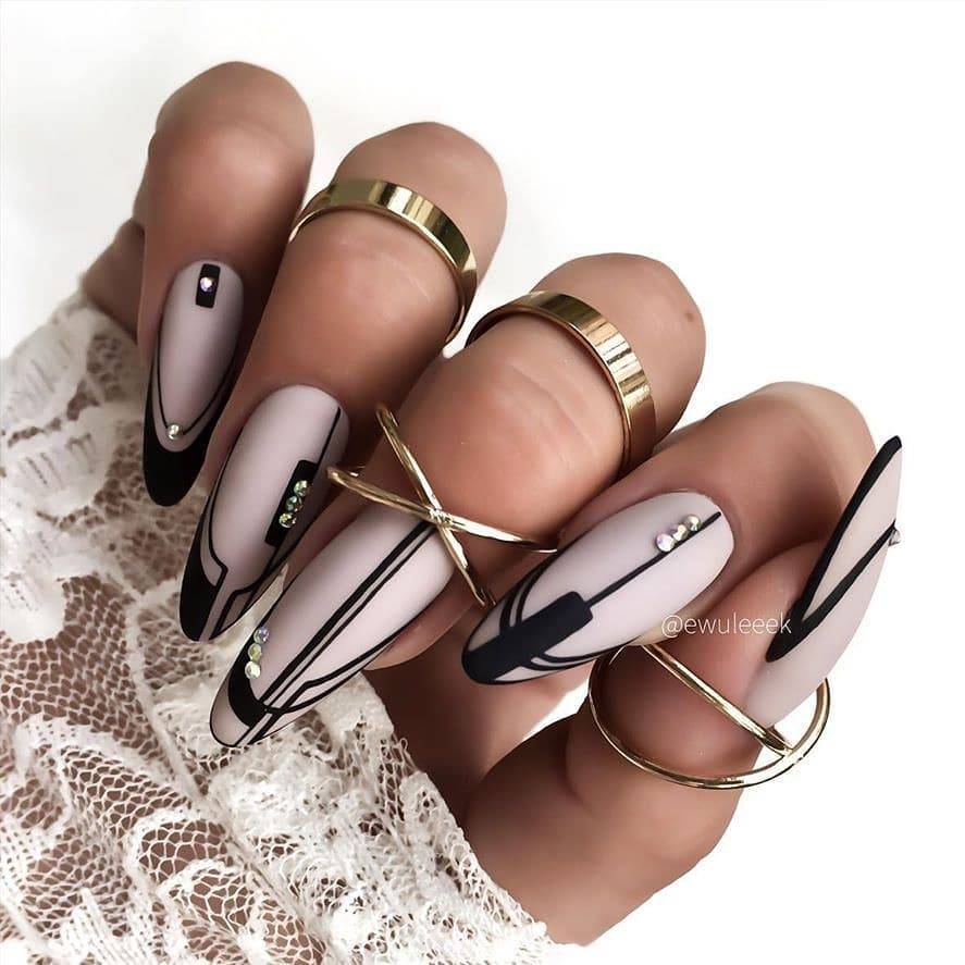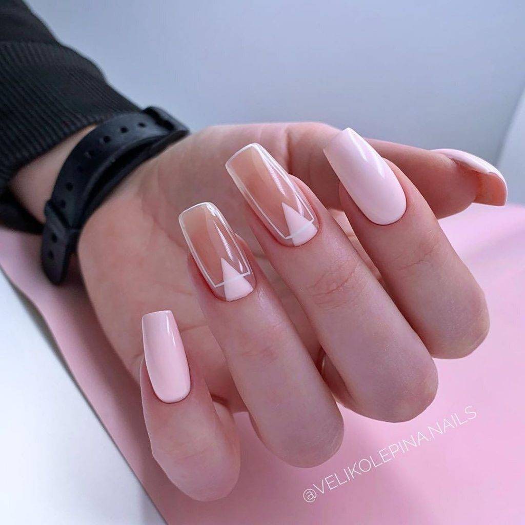 Геометрический нейл-арт актуален всегда и в сочетании с нюдовыми оттенками подобные рисунки приобретают изящность и смотрятся как-то посовременнее. Речь идет не о простых полосках и линиях, а о неповторимых сложных узорах, которые можно дополнить глиттером и цветным сочетанием.
