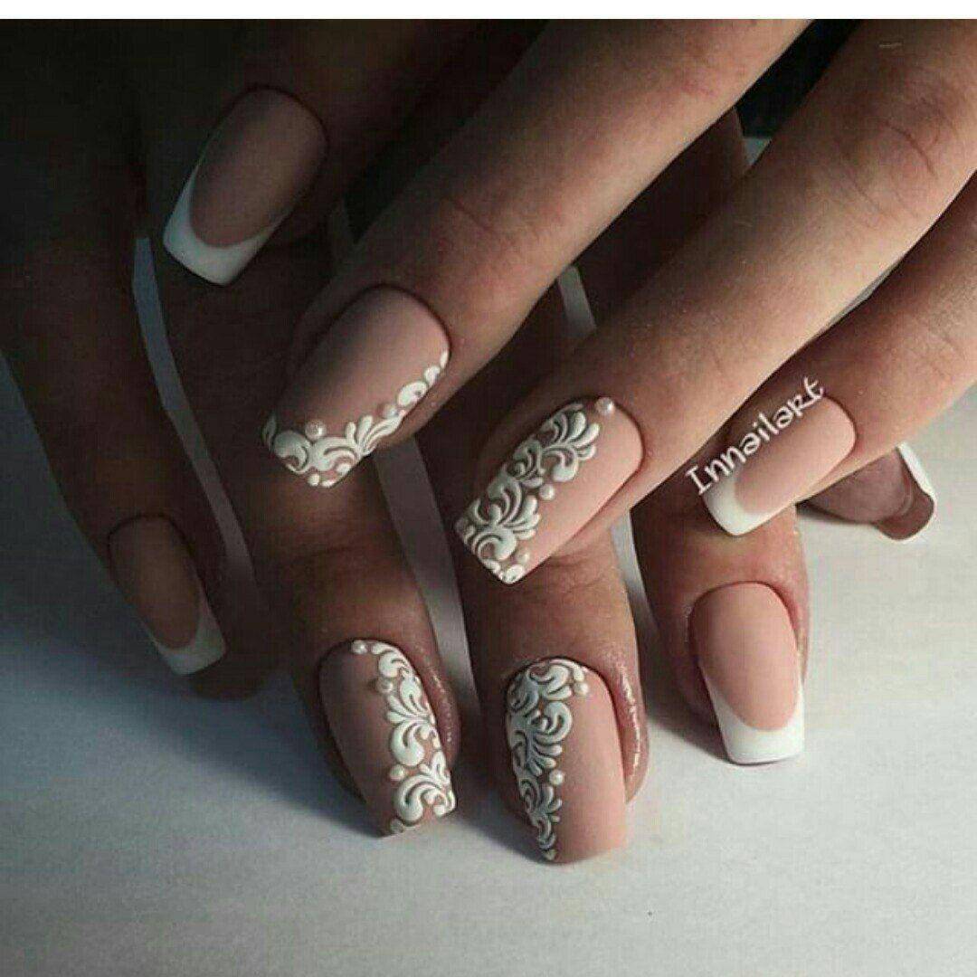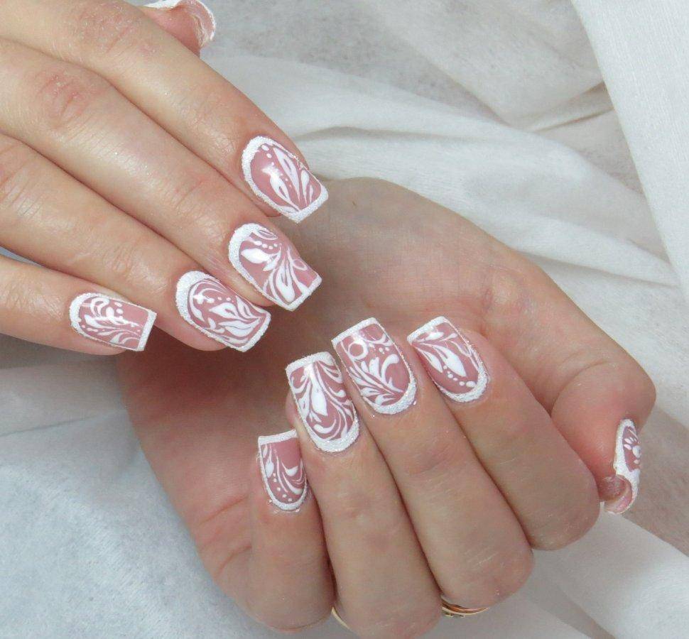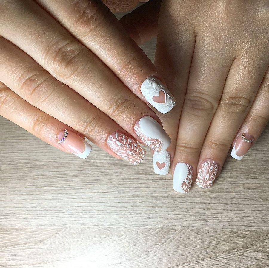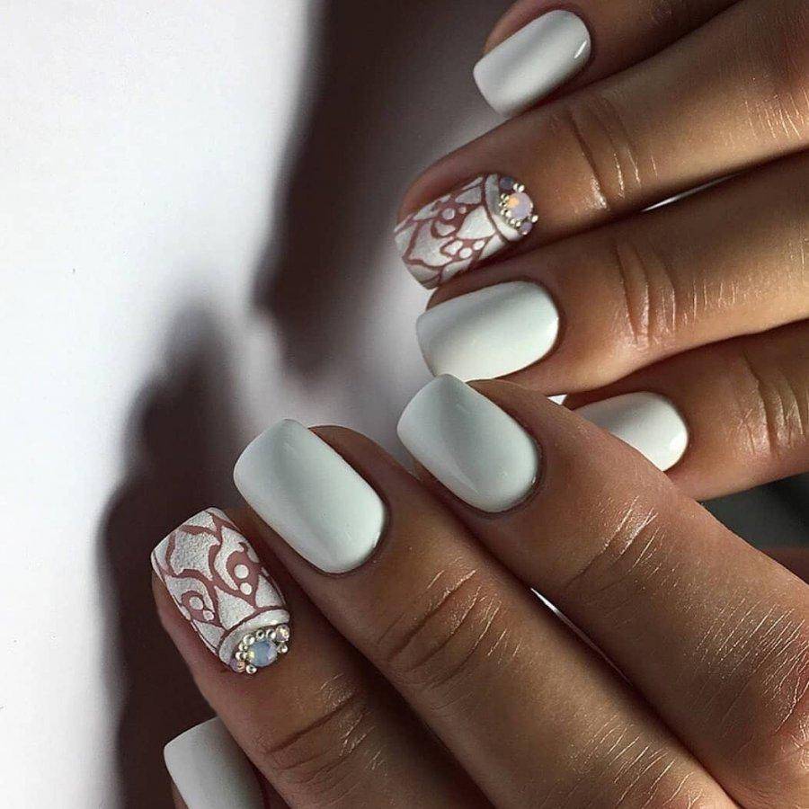 Все оттенки бежевого также являются отличной базой для свадебного маникюра, которая хорошо смотрится как с глянцевым, так и с матовым финишем, а также со всевозможным дизайном. И прежде всего стоит попробовать самую тонкую белоснежную роспись в виде вуали, кружева, орнаментов и цветочных узоров в случае необходимости дополняя их стразами среднего размера.