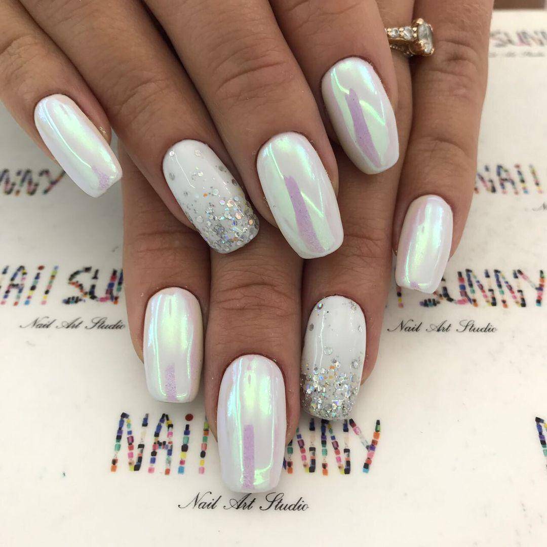 Стоит быть осторожной с глиттером — маникюр на свадьбу невесте с использованием блесток выглядит очень эффектно, но важно гармонично сочетать его с платьем. Если у твоего наряда теплый подтон — выбирай золотой глиттер, если холодный — серебряный