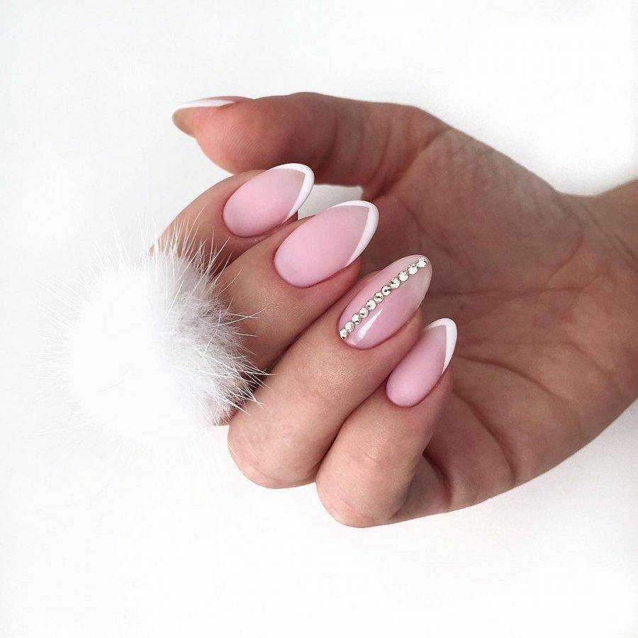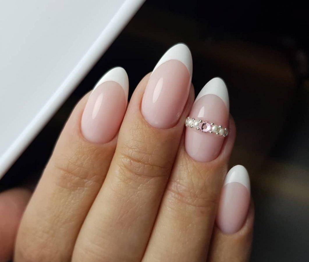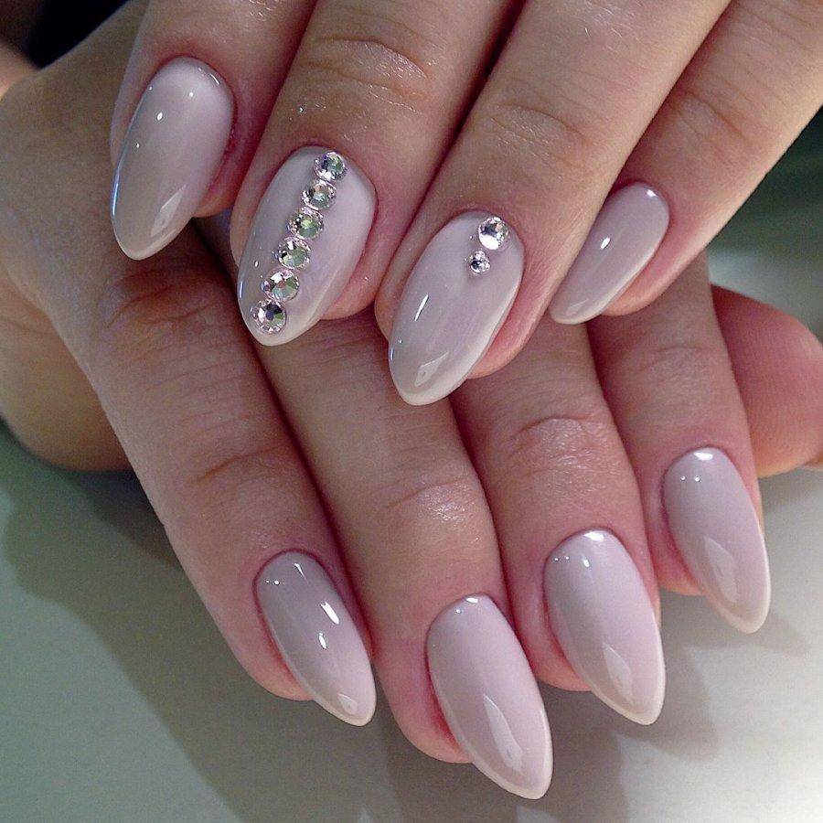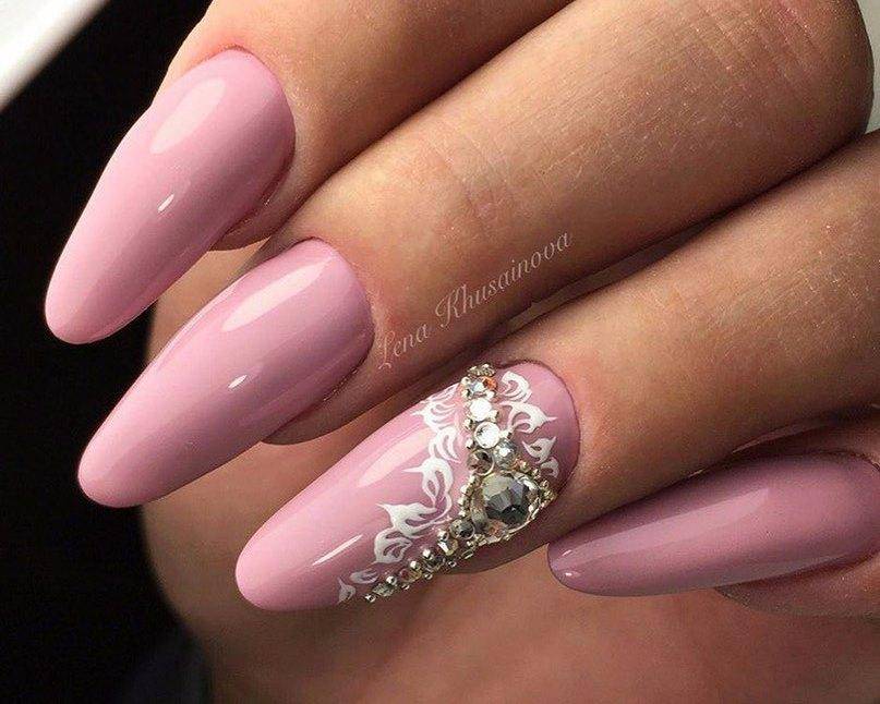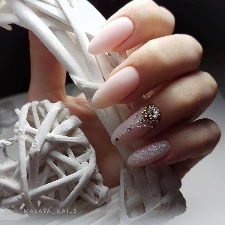 Овальные пластины в виде миндаля хороши с нюдовым матовым и глянцевым лаком, френчем, блесками, 3D-узорами. Это хорошая база для лунного дизайна с помощью страз, жемчуга, сердечек, блесток.