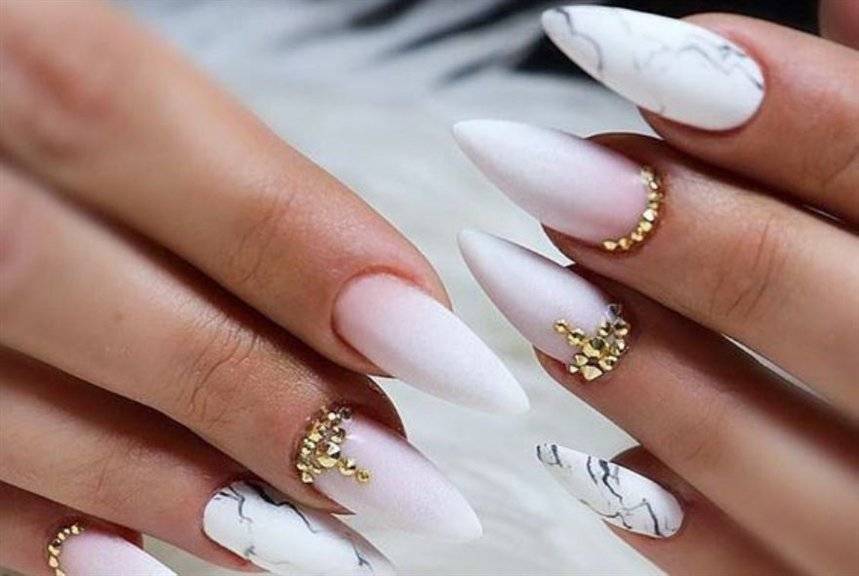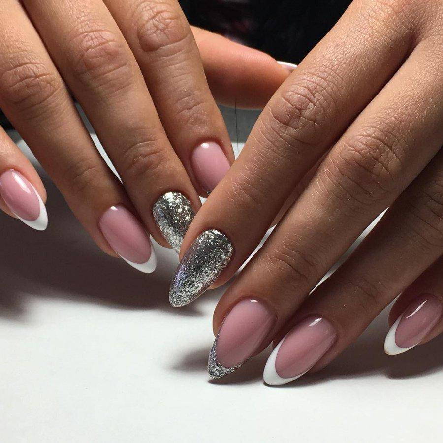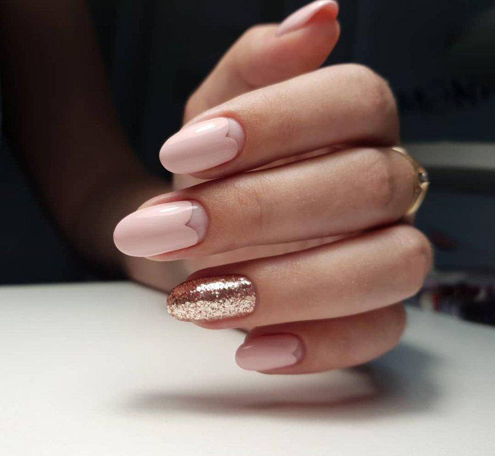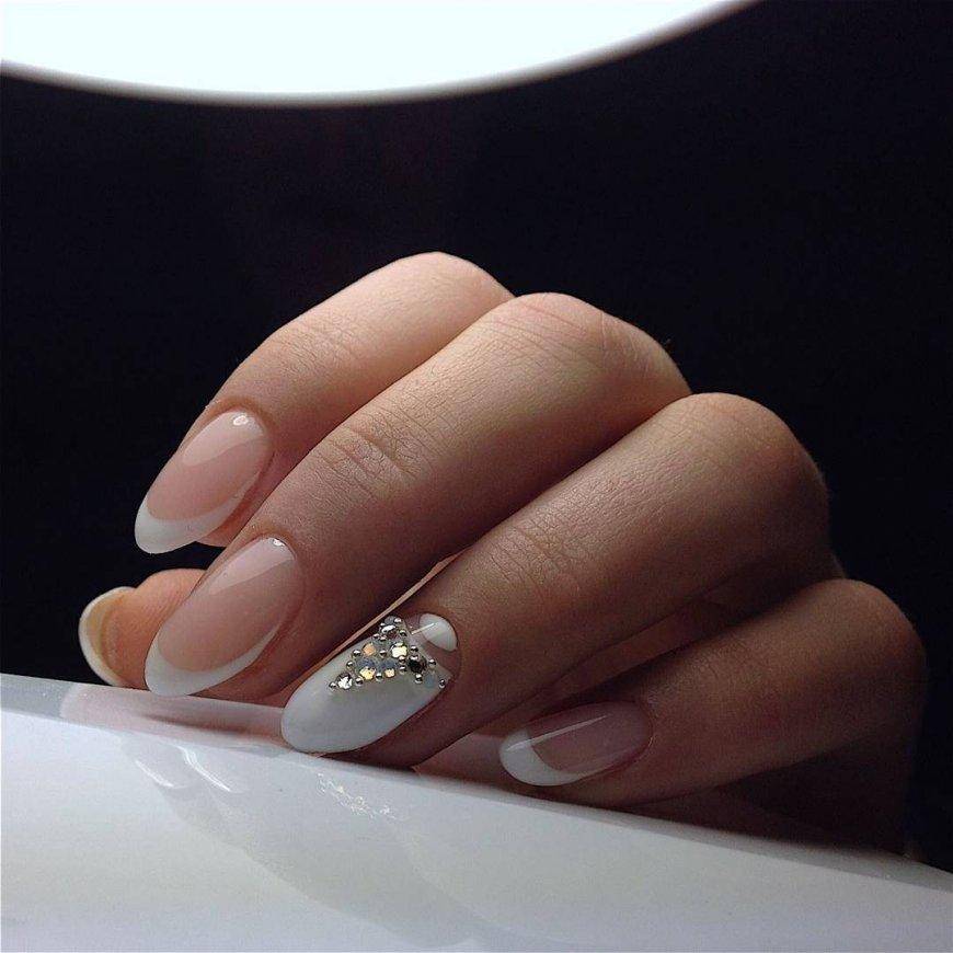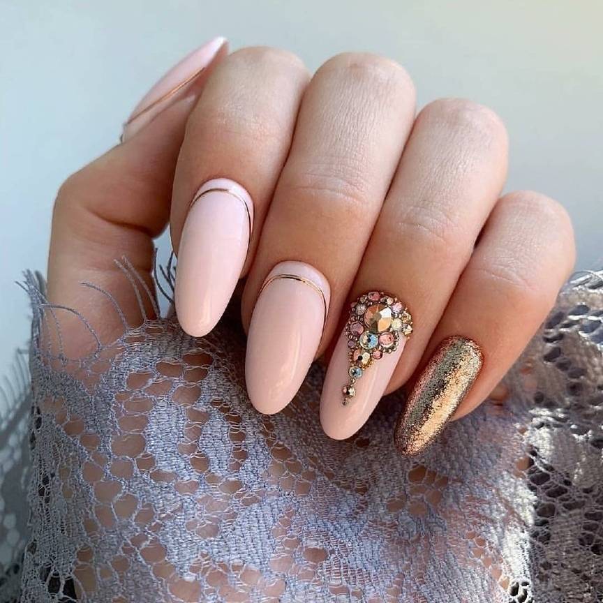 Овальные пластины в виде миндаля хороши с нюдовым матовым и глянцевым лаком, френчем, блесками, 3D-узорами. Это хорошая база для лунного дизайна с помощью страз, жемчуга, сердечек, блесток.