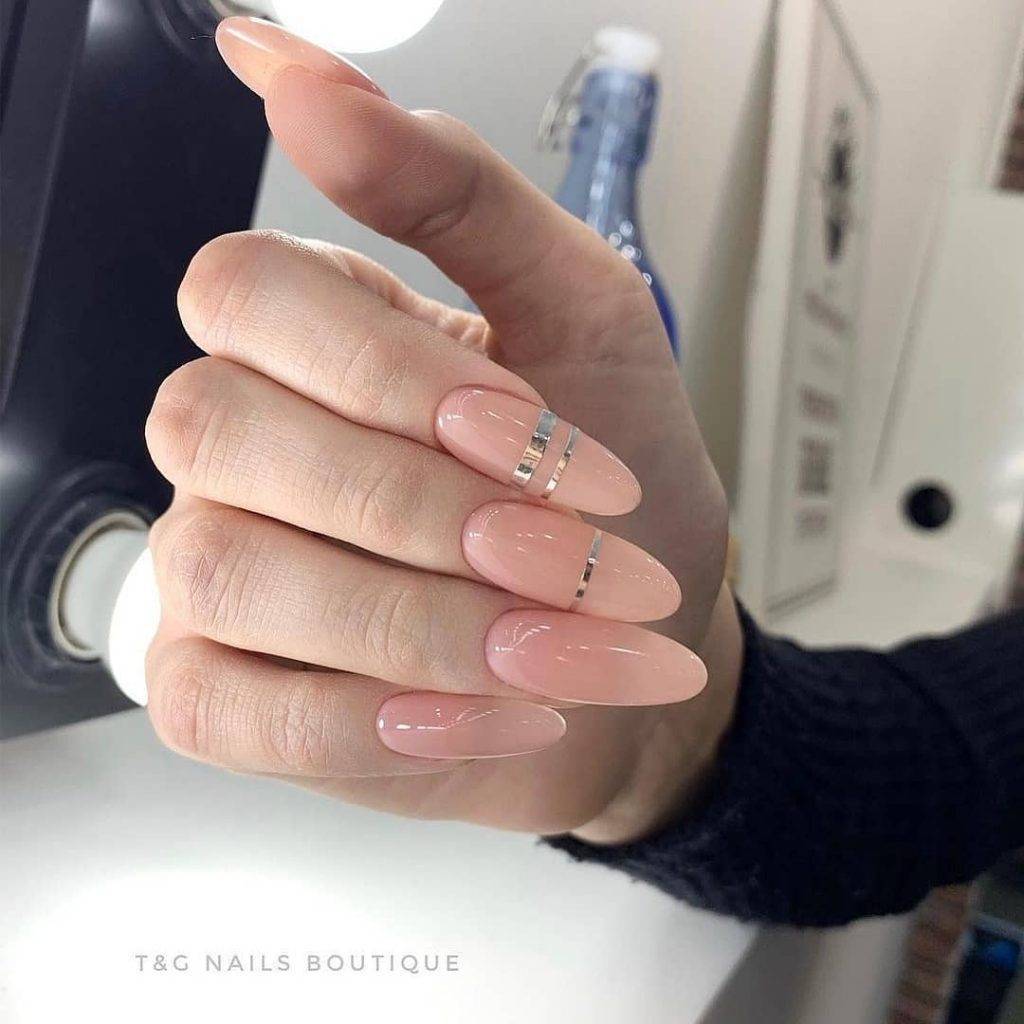 Если говорить о минимализме и нюдовом маникюре 2020-2021 то самым ярким примером дизайна здесь будут лаконичные металлизированные полоски. Подобный дизайн выглядит максимально минималистическим, при этом нюдовый маникюр сохраняет изящество и оригинальность.