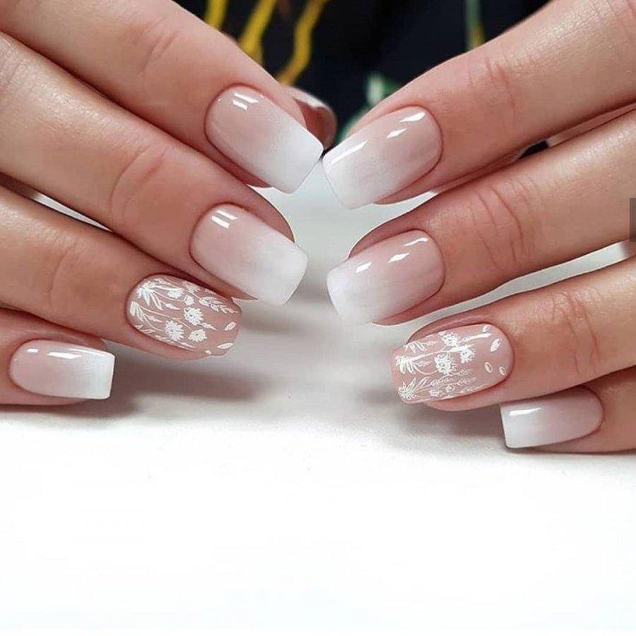 На длинных ногтях в свадебном маникюре лучше всего выглядят округлые мягкие формы. Если же вы любительница квадратной формы, выберите нюдовые оттенки и неброский дизайн. Отличным вариантом для квадратных ногтевых пластин станет нежный градиент или кружевной маникюр.