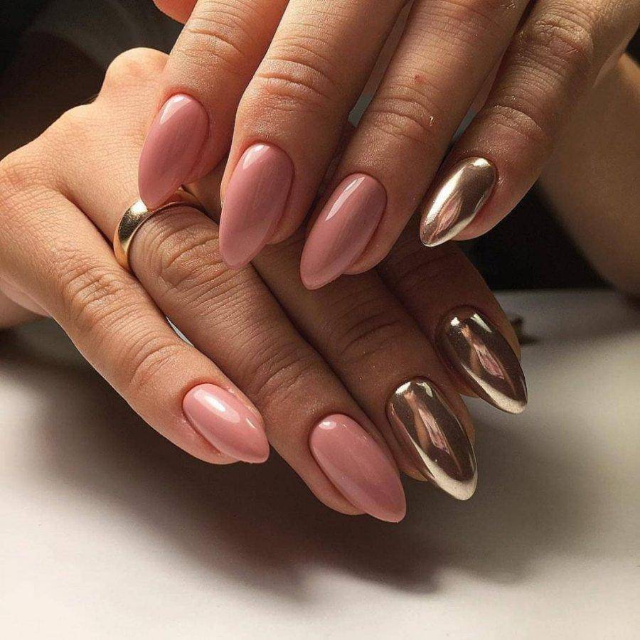 Простой и одновременно эффектный дизайн длинных нюдовых ногтей получится с фольгой. Модных вариантов подобного маникюра очень много, так как оттенок фольги, ее фактура и декорирование ею ногтей не ограничено фантазией мастера.