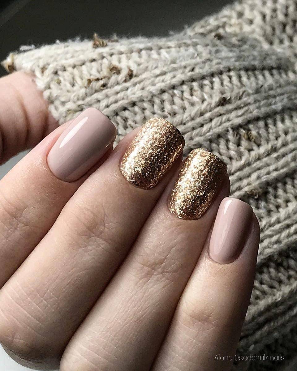 То, что нюдовые оттенки прекрасно смотрятся в тандеме с золотистыми нейл-украшениями давно не новость. Все, что напоминает нам золото (фольга, полоски, блестки, наклейки, втирка и т.п.) на нюдовых ногтях смотрится божественно и стильно.