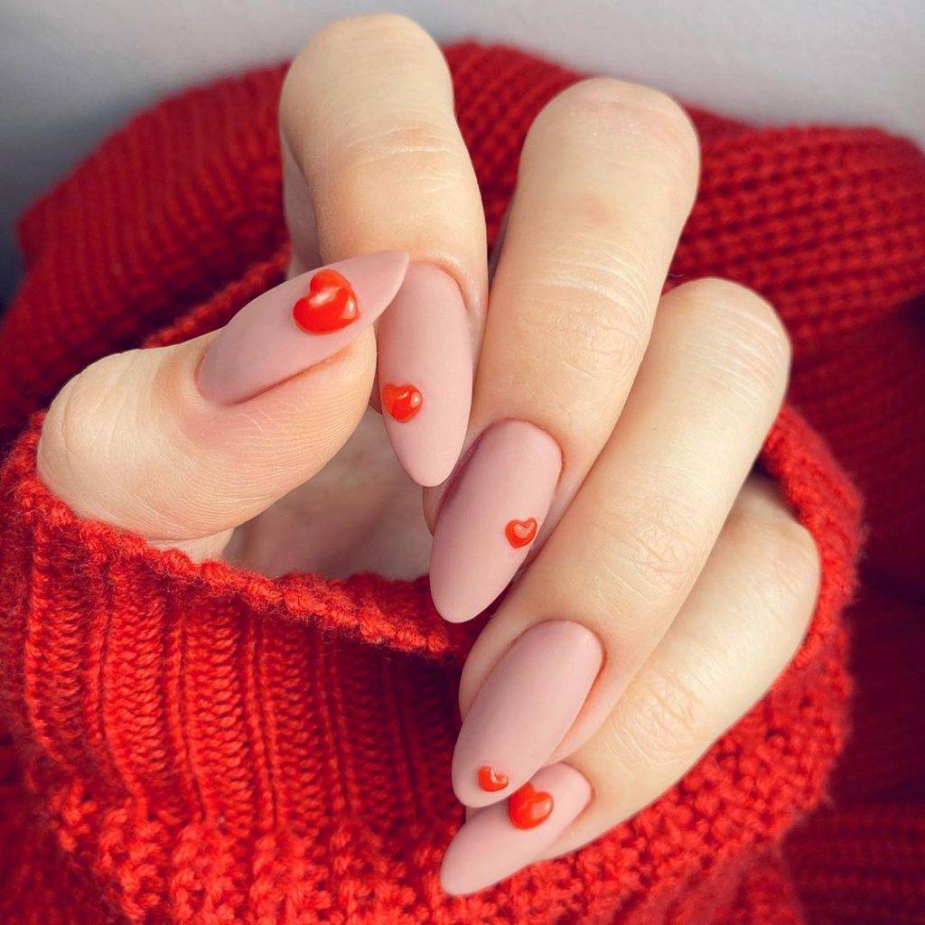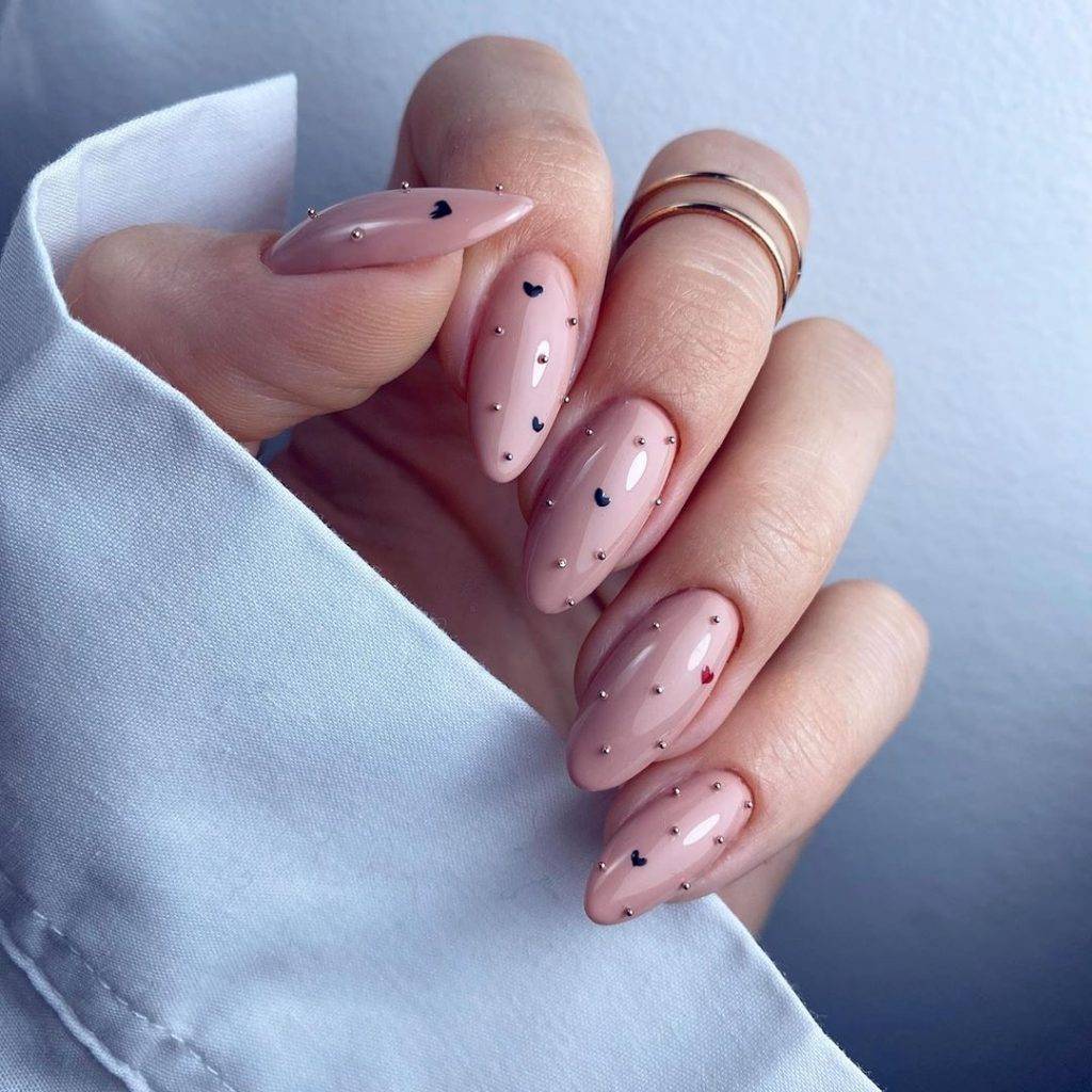 В начале нового нейл-сезона 2020-2021 года большую популярность в маникюре получили сердечки в самых неожиданных и оригинальных исполнениях. Поэтому в нюдовом маникюре изображения сердца или сердечек стало одним из самых трендовых. Советуем присмотреться к сердечному принту с дизайном крошечными бульонками на нюдовом покрытии.