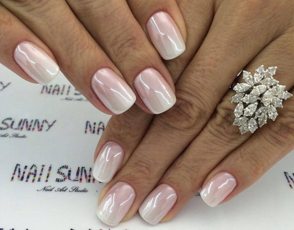 Если задача стоит наоборот не акцентировать внимание на маникюре, то конечно же стоит выбрать приглушённые розовые оттенки. Многие невесты хотят сделать акцент на обручальном кольце, чтобы на фото оно выделялось и маникюр не забирал на себя внимание