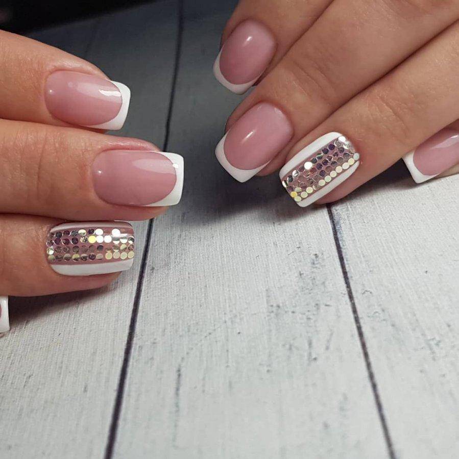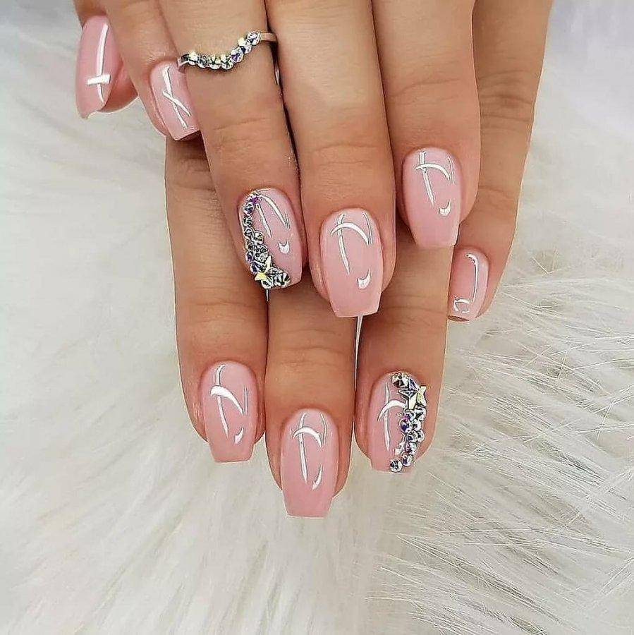 Нюдовые оттенки вот уже не первый год пользуются огромной популярностью в нейл-дизайне, даже если он относится к свадебному. Среди возможных вариантов – античная роза (пудра), светлый беж и даже небесный голубой, каждый из которых прекрасно сочетается с базовым декором в виде выложенных по ногтевому ложу в одну линию страз, самого мелкого шиммера, лепки и прочих вариаций на тему.