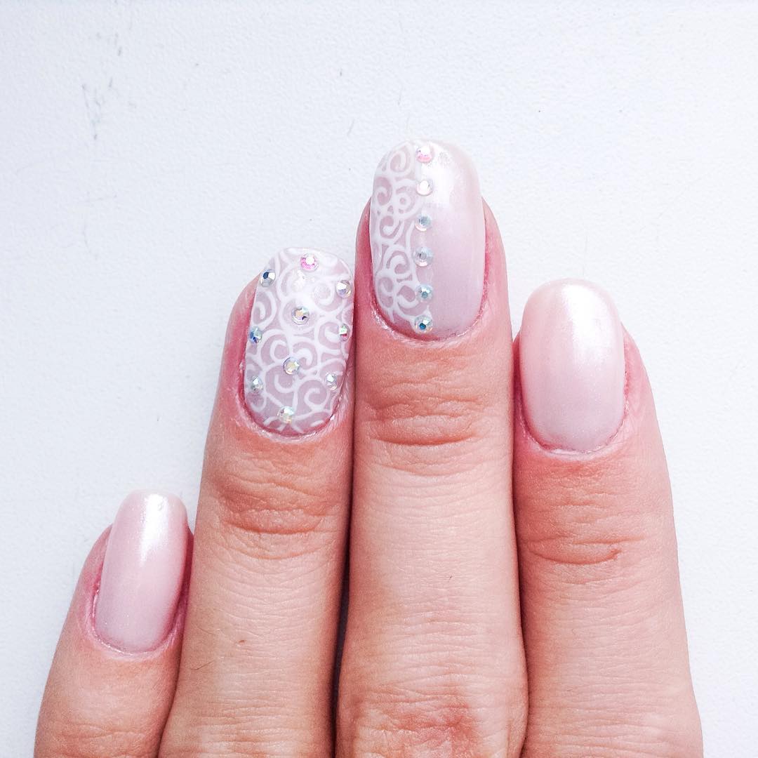 Очень красиво и необычно на ногтях будет смотреться перламутровый нюдовый маникюр с изящным узором, нанесенным в технике стемпинга. Для нежности дизайна лучше использовать белую краску для стемпинга.
