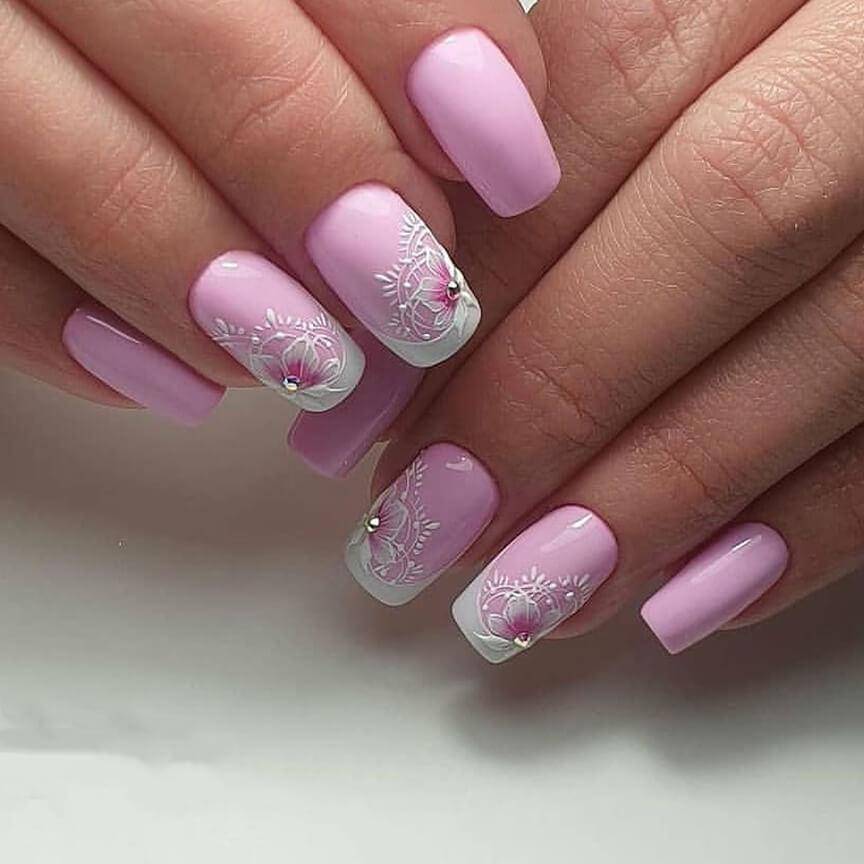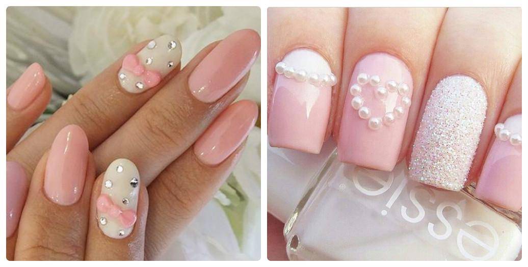 Под нежно-розовое платье или букет – соответствующий цвет. Его можно сочетать с белоснежным френчем, мелкими кристаллами, лепкой и бархатом.