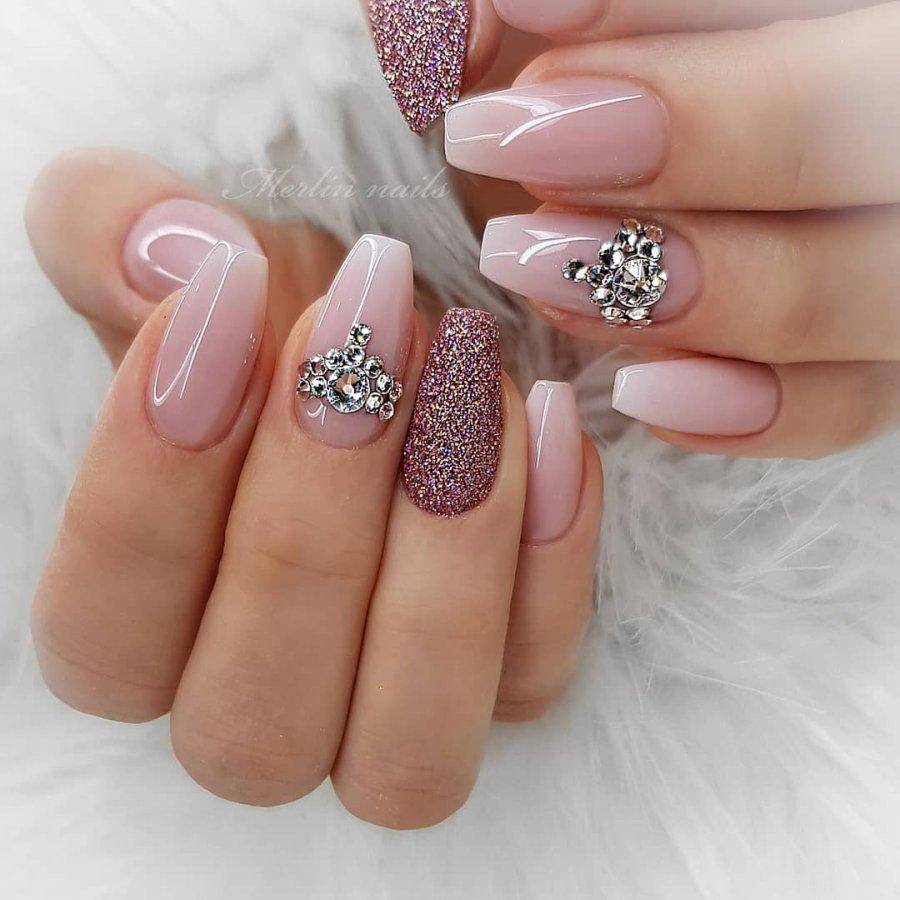 Иногда бывает сложно определиться: стразы или блестки использовать в дизайне нюдового маникюра? Зачем выбирать, вместе блестки и стразы смотрятся еще круче и красивее. Сделайте на указательном ноготке инкрустацию, а мизинец покройте глиттером.