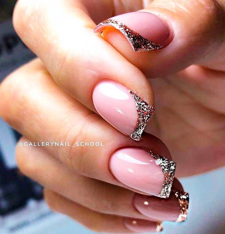 Очень современно и оригинально будет выглядеть блестящий французский маникюр на длинных острых ноготках или на ноготках формы балерина.
