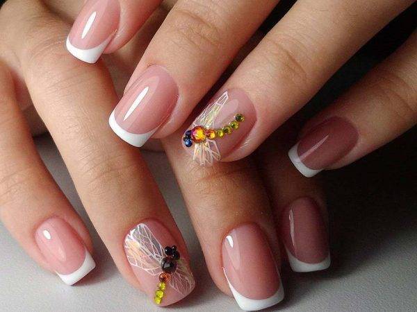К маникюру со стрекозой можно добавить в качестве украшения стразы.