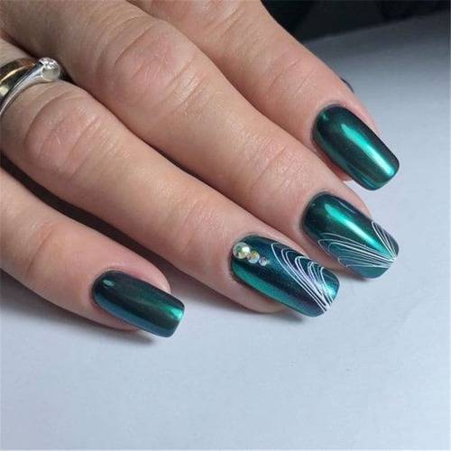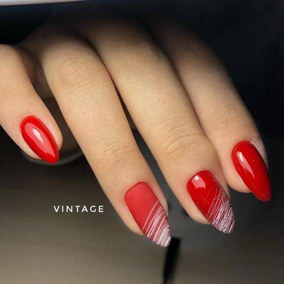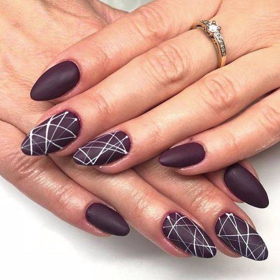 Стильно, дерзко и со вкусом — только так можно описать такой маникюр. Глянец отлично смотрится под прямыми линиями тонкой паутинки. На фото ногти будут переливаться под вспышкой, а паутина красиво оттенит тот самый глянец.