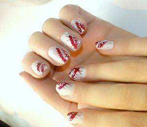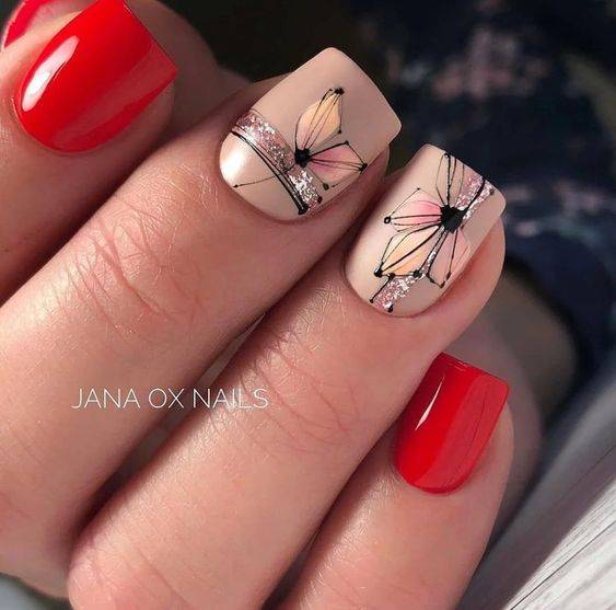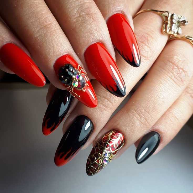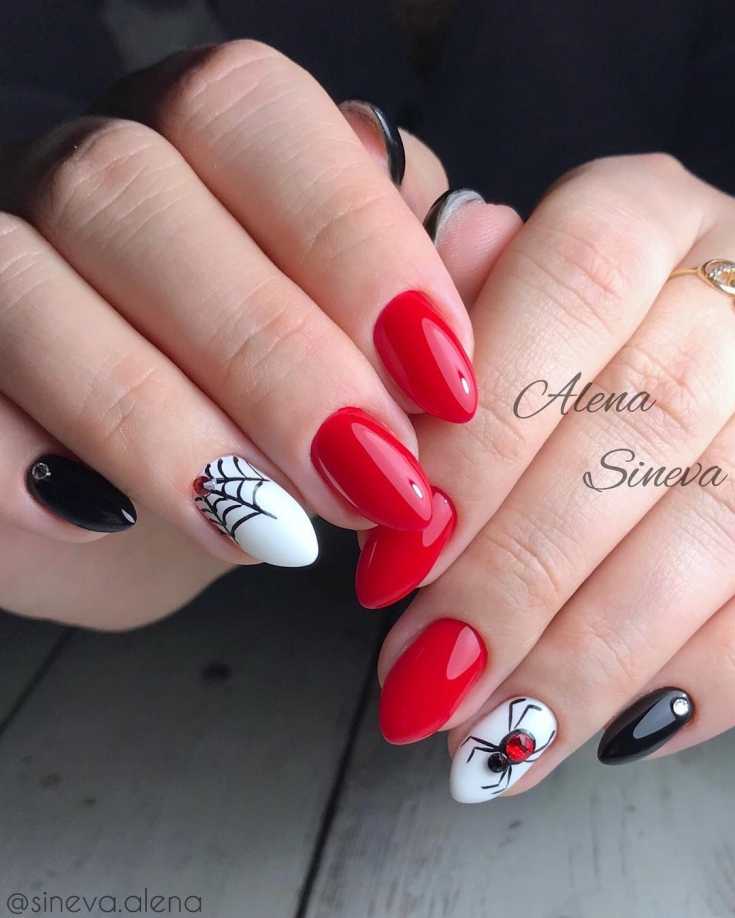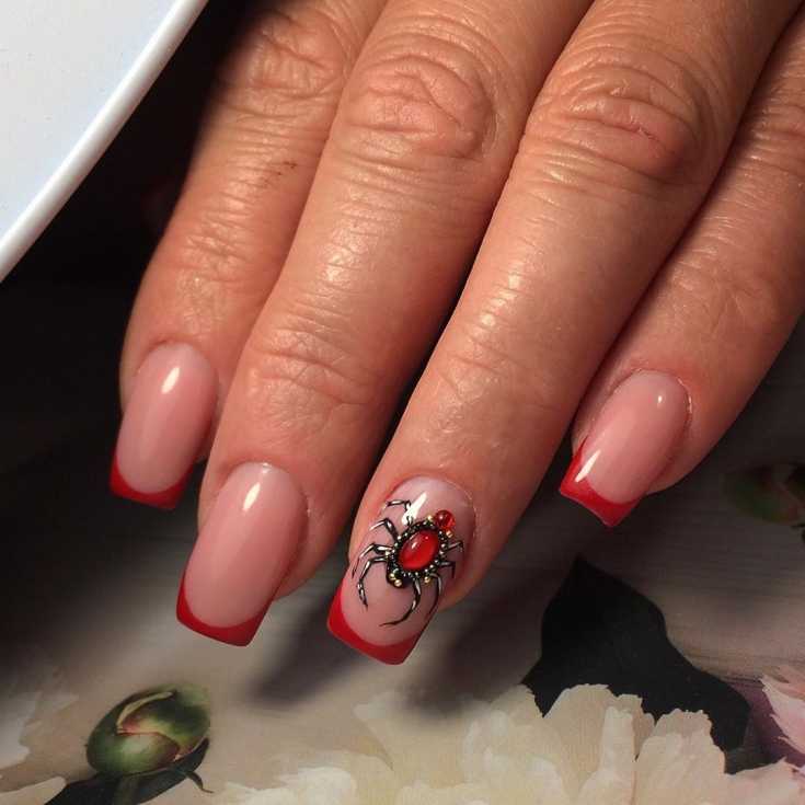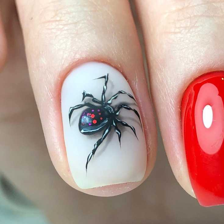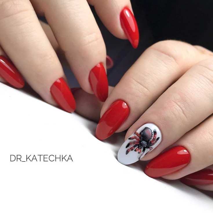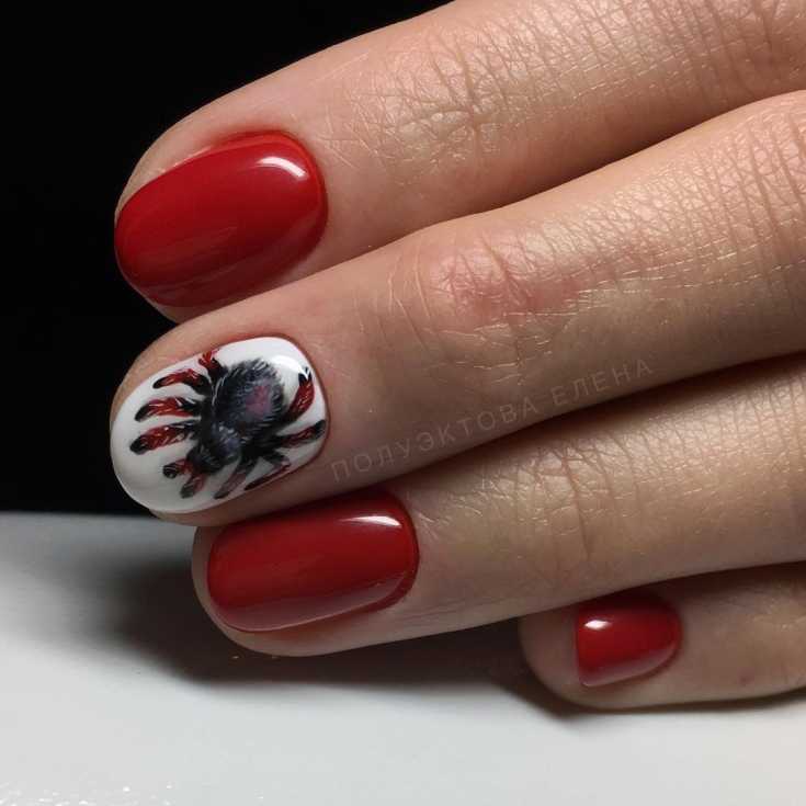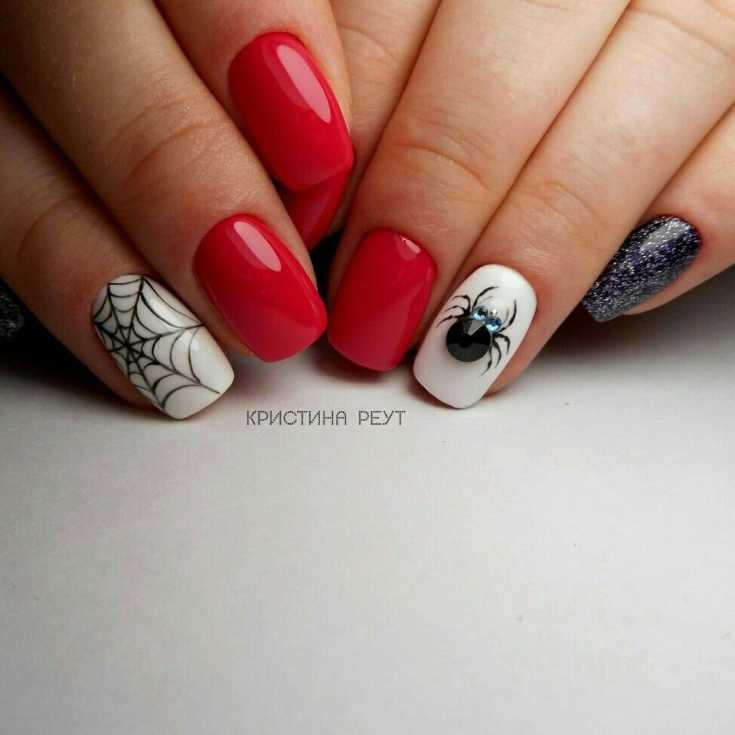 Красный и белый красивый маникюр с пауком.