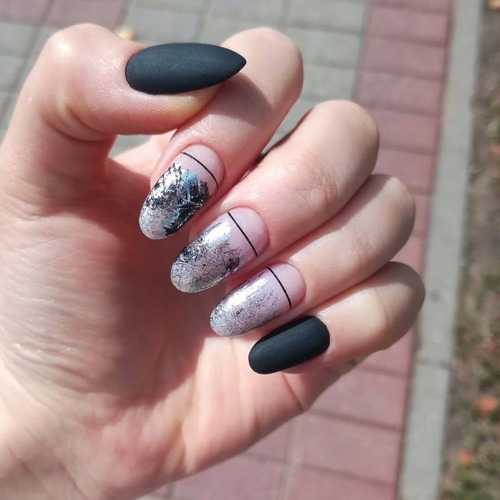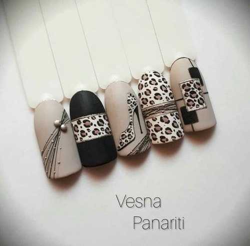 Для дизайна используется комбинация материалов и техник. На одной ногтевой пластине могут уместиться блестки, фольга, аппликация, стразы. Оригинально и модно смотрится леопардовый принт в сочетании с дерзкой черной паутинкой. Также можно добавить прямые линии.
