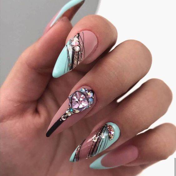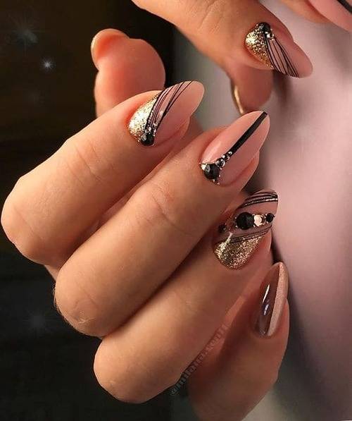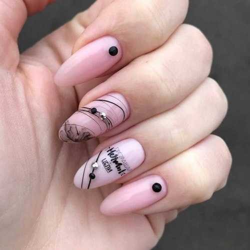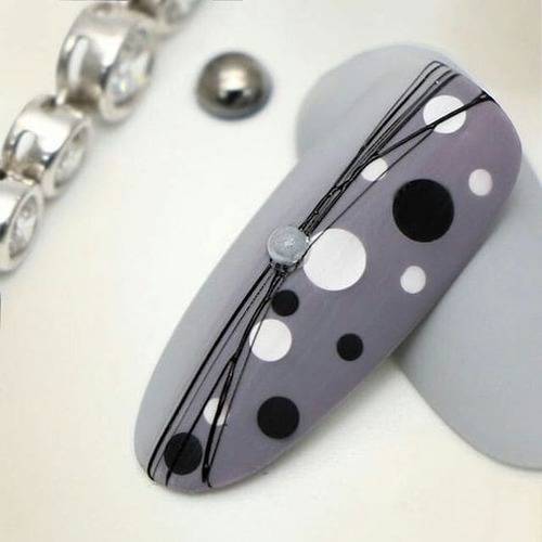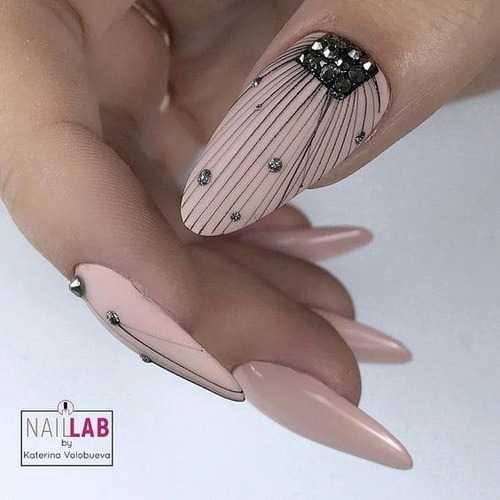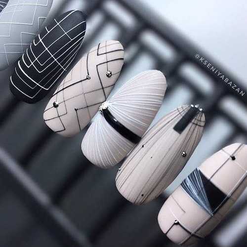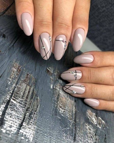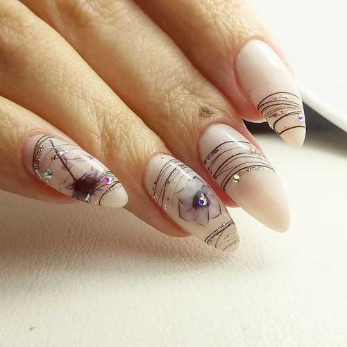 Посередине пластины можно поставить кляксу, а затем мастера начинают вытягивать из нее прямые геометрические линии. Если на месте кляксы остается некрасивая точка, ее можно скрыть под изящной стразинкой. Можно нарисовать совершенно разные фигуры, но главное не переборщить. Минимализм всегда остается в моде: пара линий выглядят лучше, чем параллелограмм на ногтевой пластине.