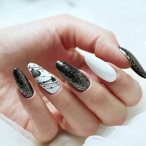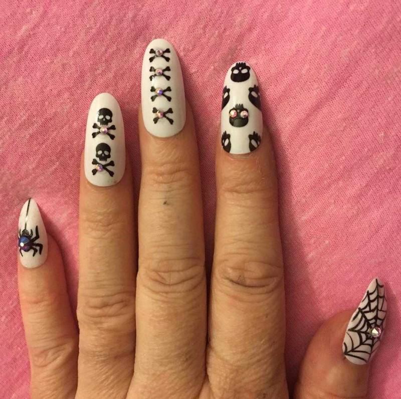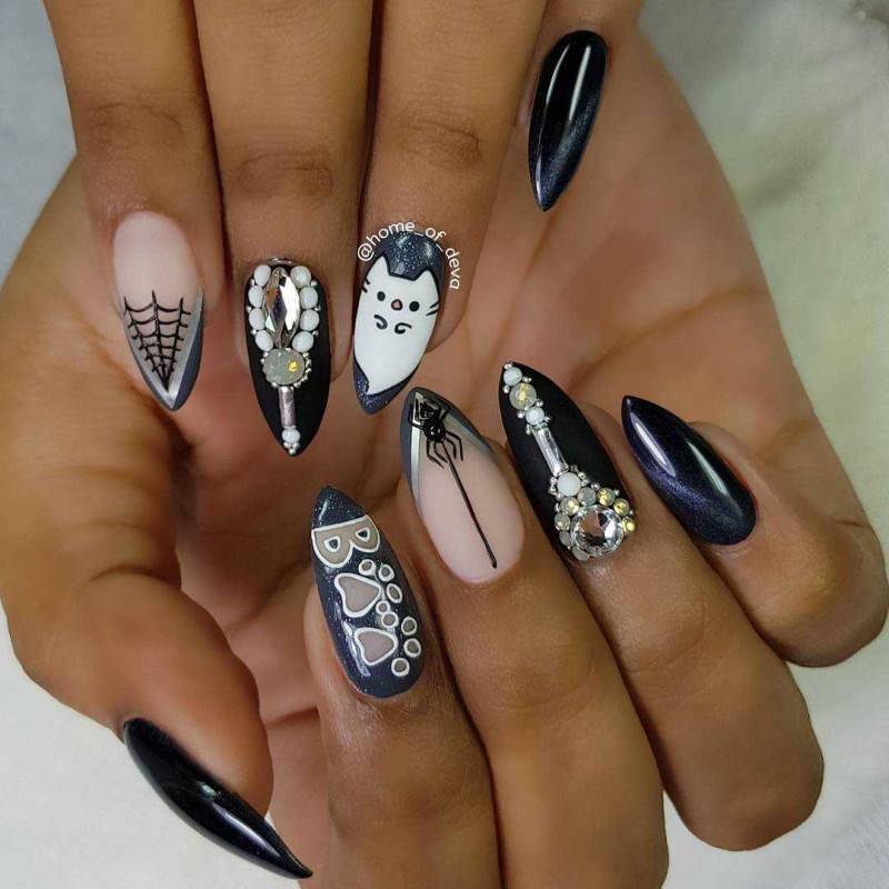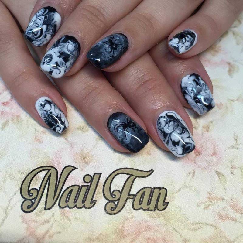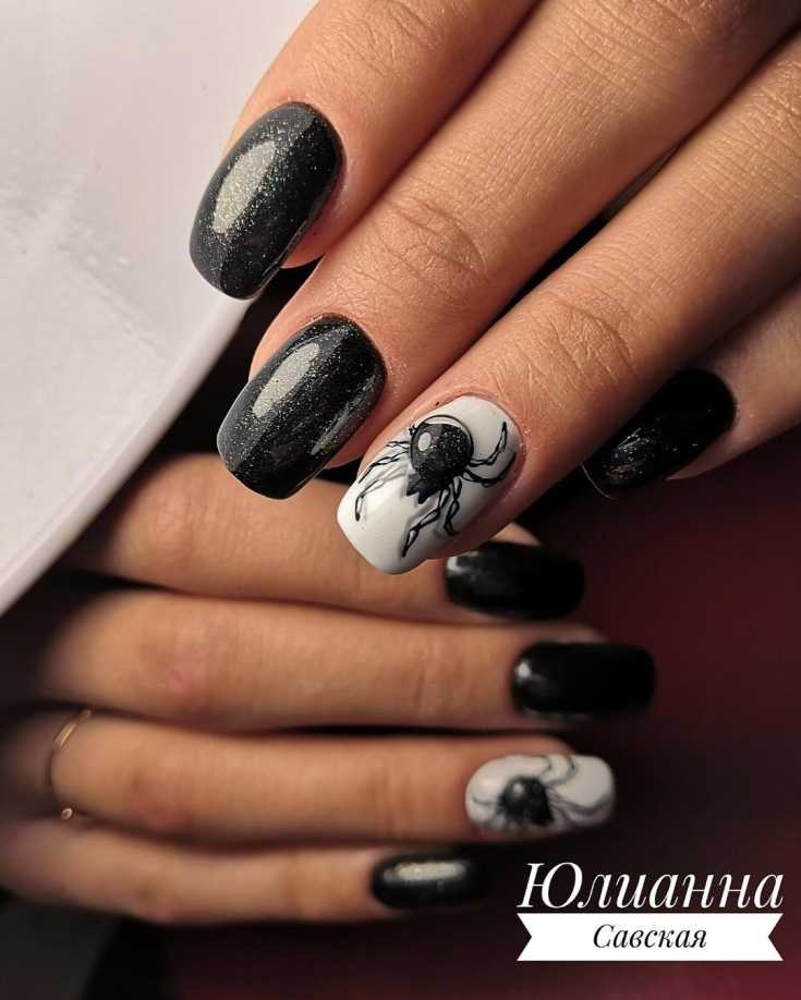 Красивый маникюр в черно белом цвете с паучком и котиком.