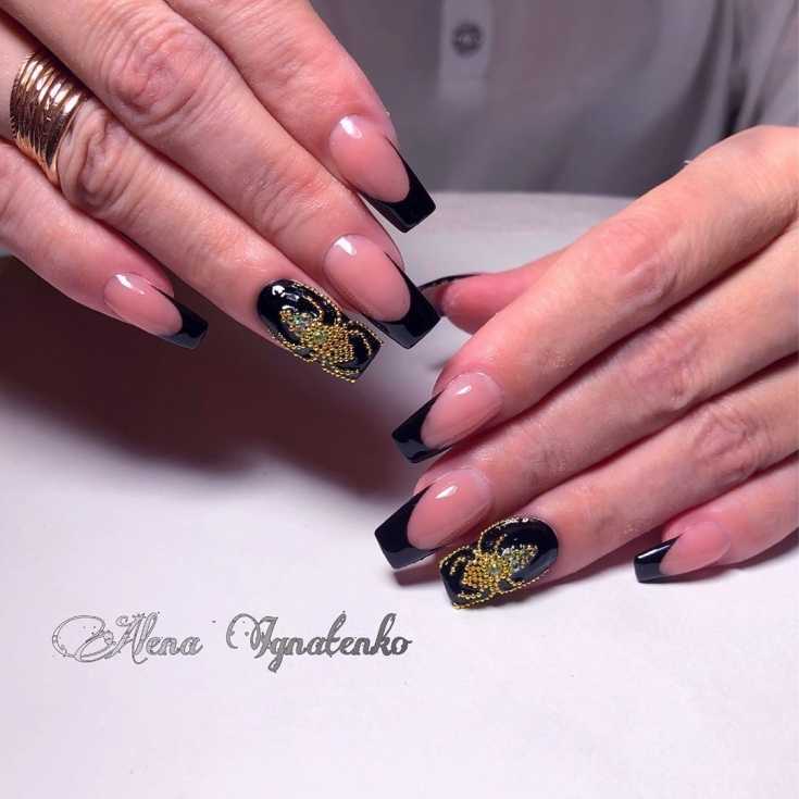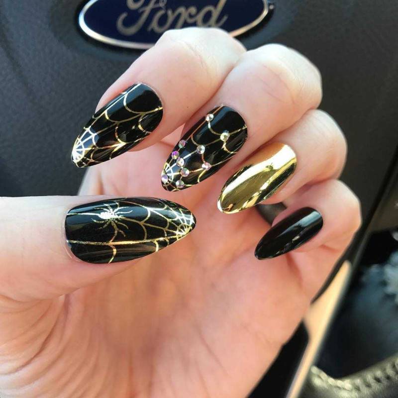 Золотая зеркальная паутина и паук на черных ногтях со стразами.