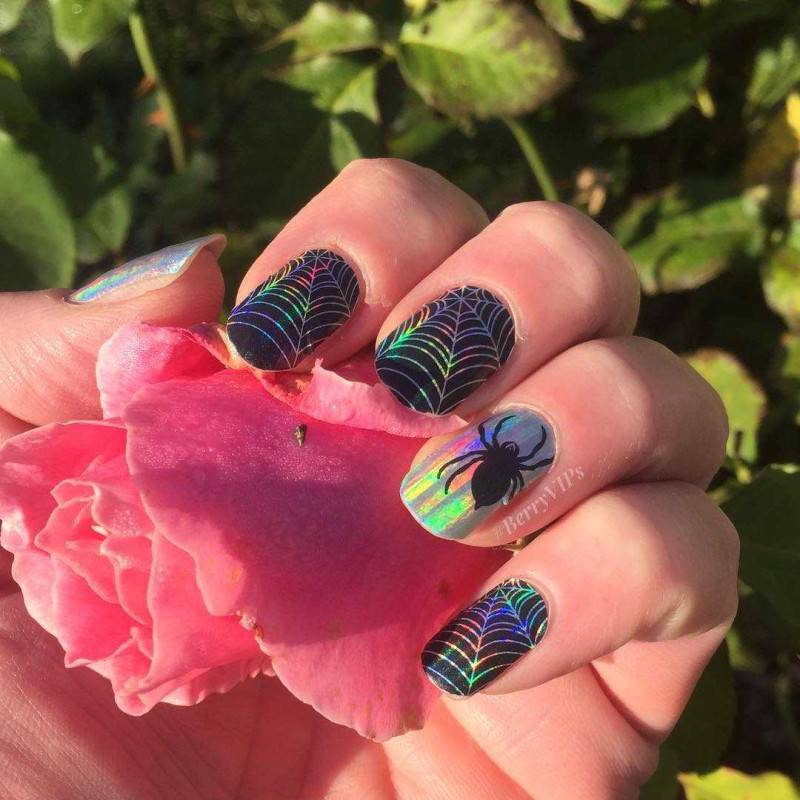 Черный паук на голографиечском маникюре.