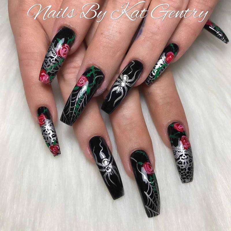 Серебристый паук с паутиной на черных острых ногтях.