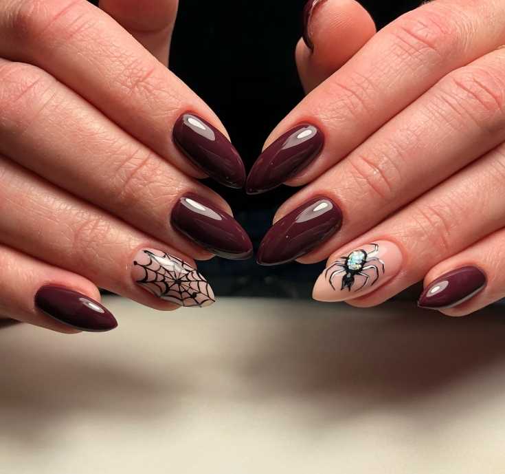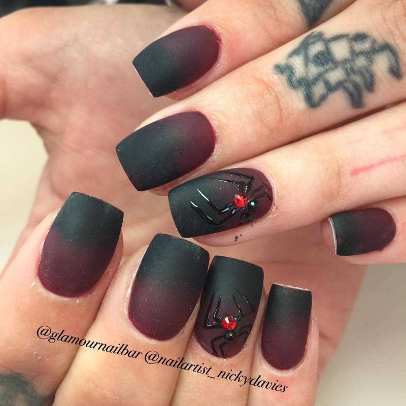 Маникюр бордово черный градиент с пауком.