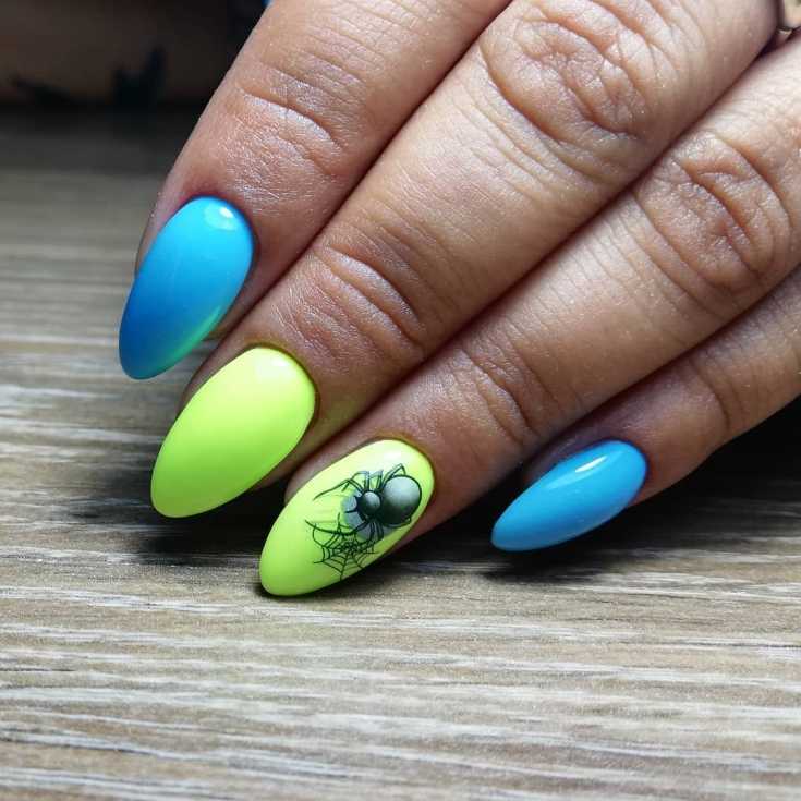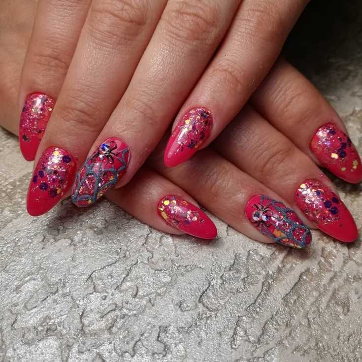 Рисунок паука на ногтях трех цветов с глиттером.