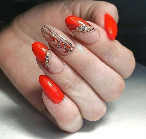 Осень щедра на дизайны с желто-зелеными листьями. Также для создания осеннего дизайна подойдет золотая фольга или металлизированные наклейки под золото. В тренде будут текстурные дизайны, напоминающие кору дерева или прожилки листьев. Также мастера будут продолжать воплощать идеи яркого маникюра с паутинкой, похожего на популярные сейчас летние фруктовые дизайны. Только вместо арбуза на них будет тыква или еще какие-то тематические изображения. Также в качестве осеннего подойдет маникюр с золотой паутинкой.