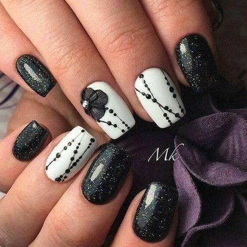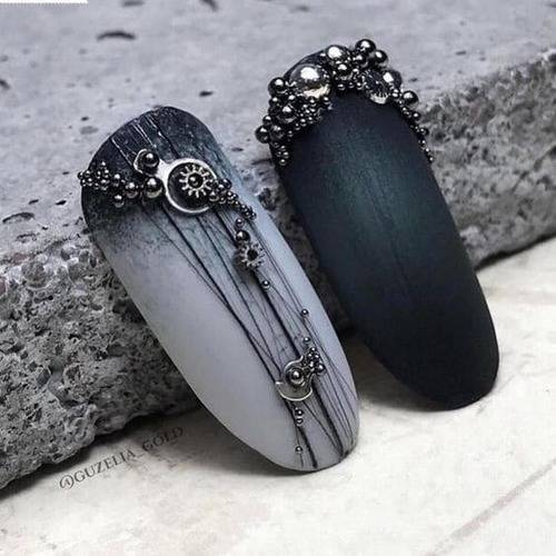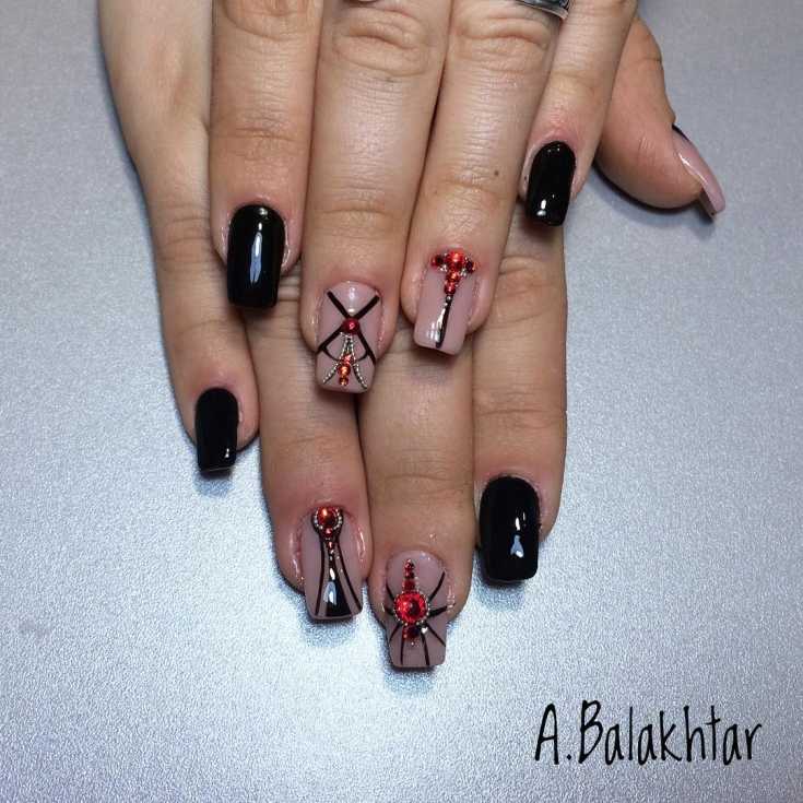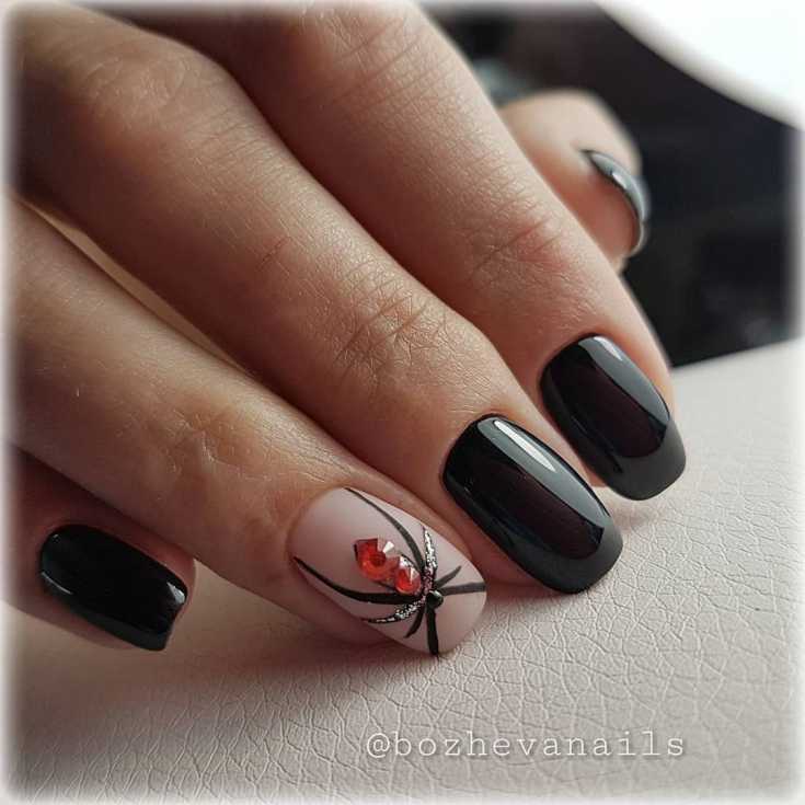 Чёрный цвет ценится за свою глубину и великолепные возможности. Сочетаемость его с паутинкой поразительна. Но в идеале — это белая или серебристая паутинка. Можно добавить совсем немного элементов для ощущения завершённости. От других цветов чёрный отличается истинным благородством.