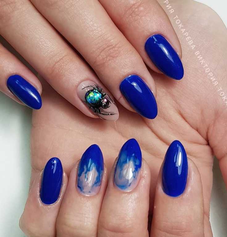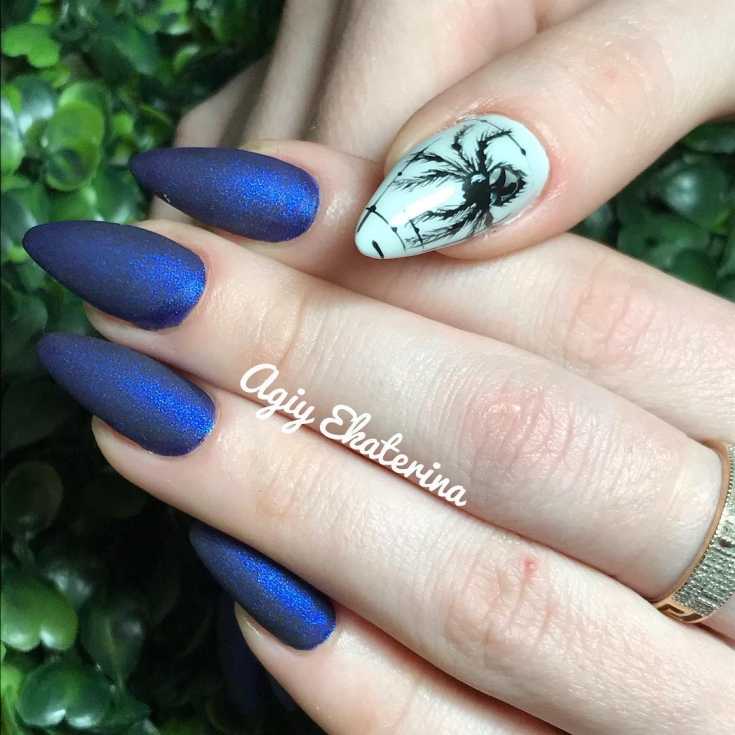 Темно синий и белый маникюр с пауком.