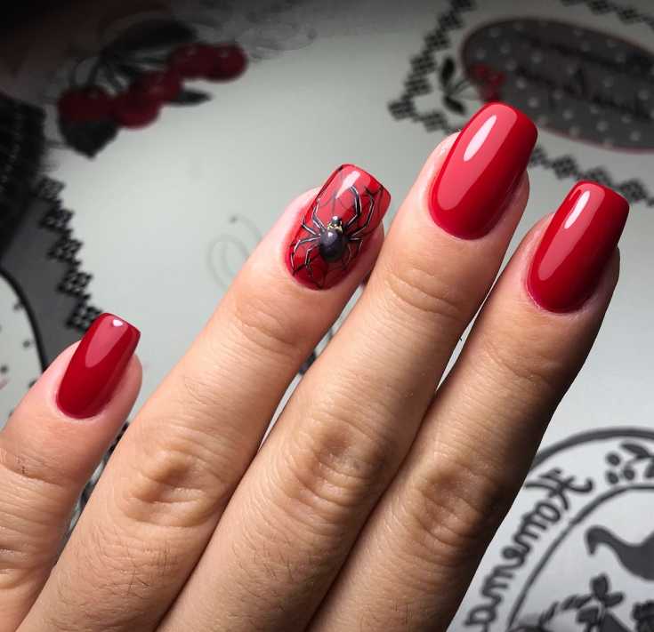 Красивые красные ногти с пауком и паутиной.