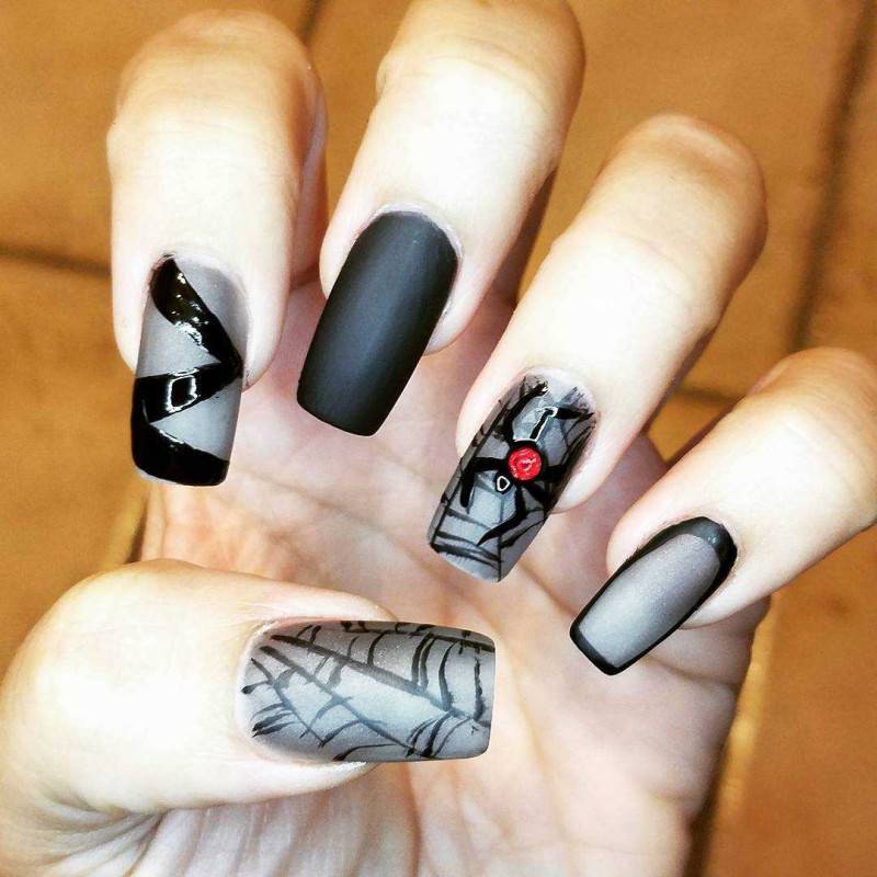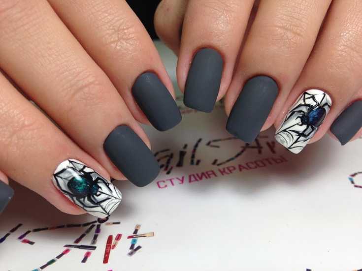 Матовый темно серый маникюр с пауком и паутиной фото.