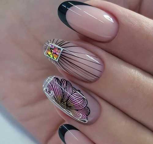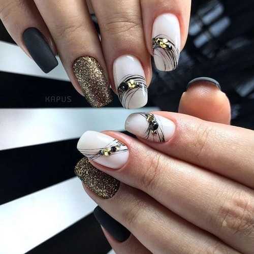 На одной ногтевой пластине могут уместиться блестки, фольга, аппликация, стразы. Оригинально и модно смотрится леопардовый принт в сочетании с дерзкой черной паутинкой. Также можно добавить прямые линии
