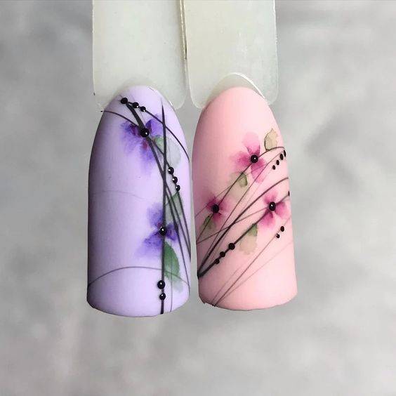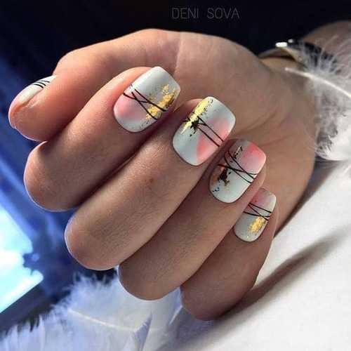Весенний маникюр гель-краской паутинка — это сборная солянка из цветочных принтов и всевозможных веточек. Повседневным нейтральным вариантом мог быть французский маникюр с блестками и веточкой, дополненный парой штрихов белой паутинки. В тренде были однотонные черные рисунки на камуфляже с цветными каплями. Для обрамления рисунков в таких дизайнах тоже часто можно было встретить паутинку. Также были очень популярны абстрактные узоры в весенних нежных нюдовых тонах.