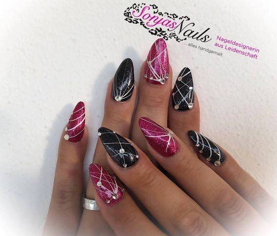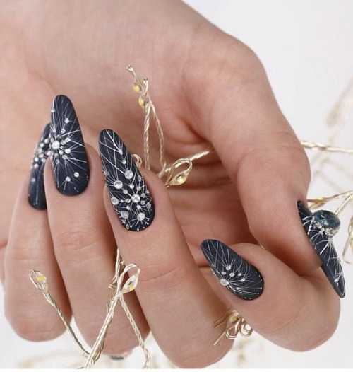 Для такого маникюра можно сперва нанести изящные тонкие линии паутинки, а на точки их пересечения положить стразы. Такой маникюр будет смотреться утонченно и закончено.