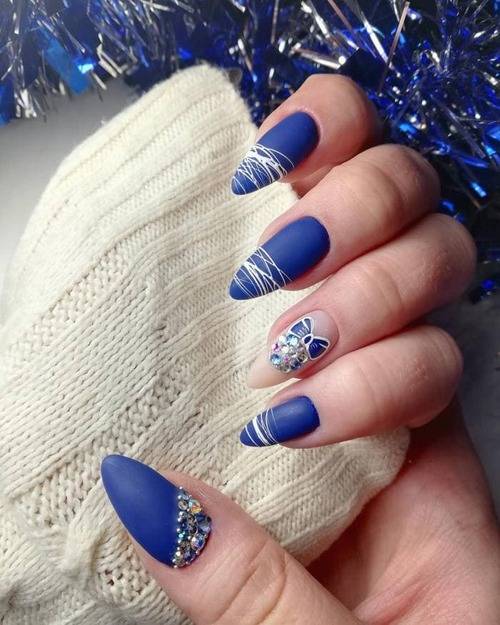 Синий цвет считается зимним. С его помощью обычно создают новогодний дизайн, выдержанный в синих тонах, припорошенных белой пудрой из акрила. Предпочтительней брать густой тёмный цвет. Из элементов хорошо смотрятся стразы, крошечные конфетти, фольга и бульонки.