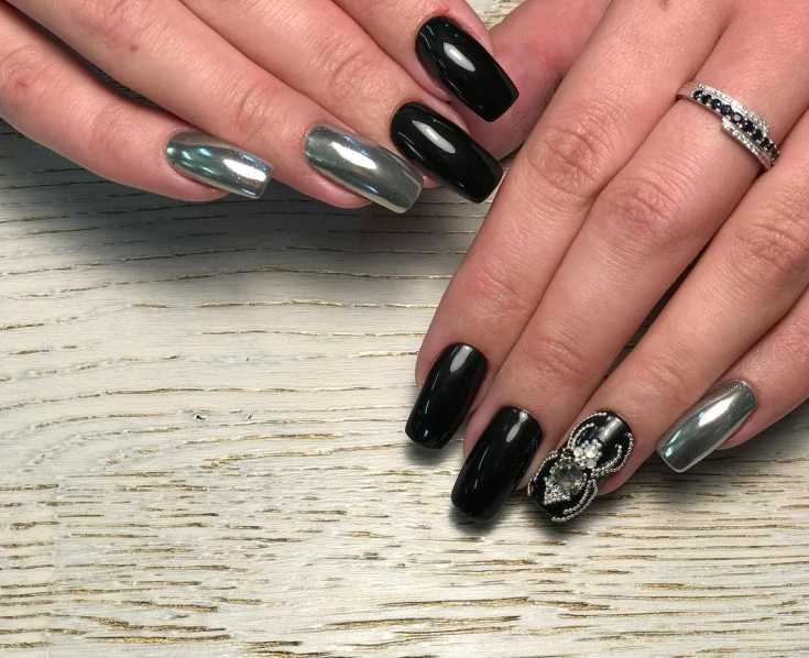 Серебристая паутина черных ногтях со стразами.