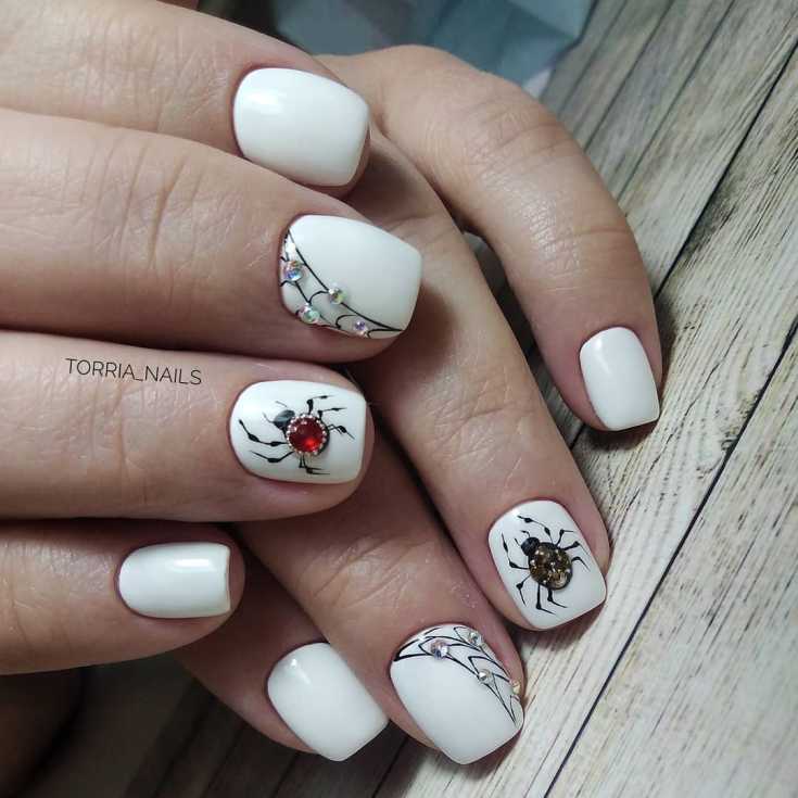 Паук на ногтях дизайн белого цвета.