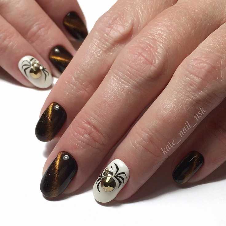 Дизайн ногтей 2019 пауки на коричневых ногтях кошачий глаз.