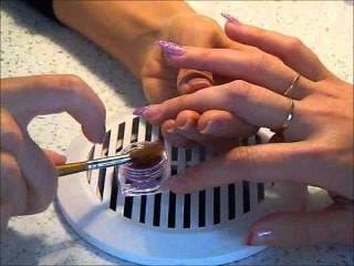 На непросохшую базу наносится акриловый порошок. Порошок может быть бесцветным (в том случае если на ногти не будет наноситься декоративное покрытие), а можно использовать и цветной порошок (в случае если производится укрепление ногтей акриловой пудрой под гель, цвет акриловой пудры не принципиален, все равно он перекроется пигментом, выбранного лака)
